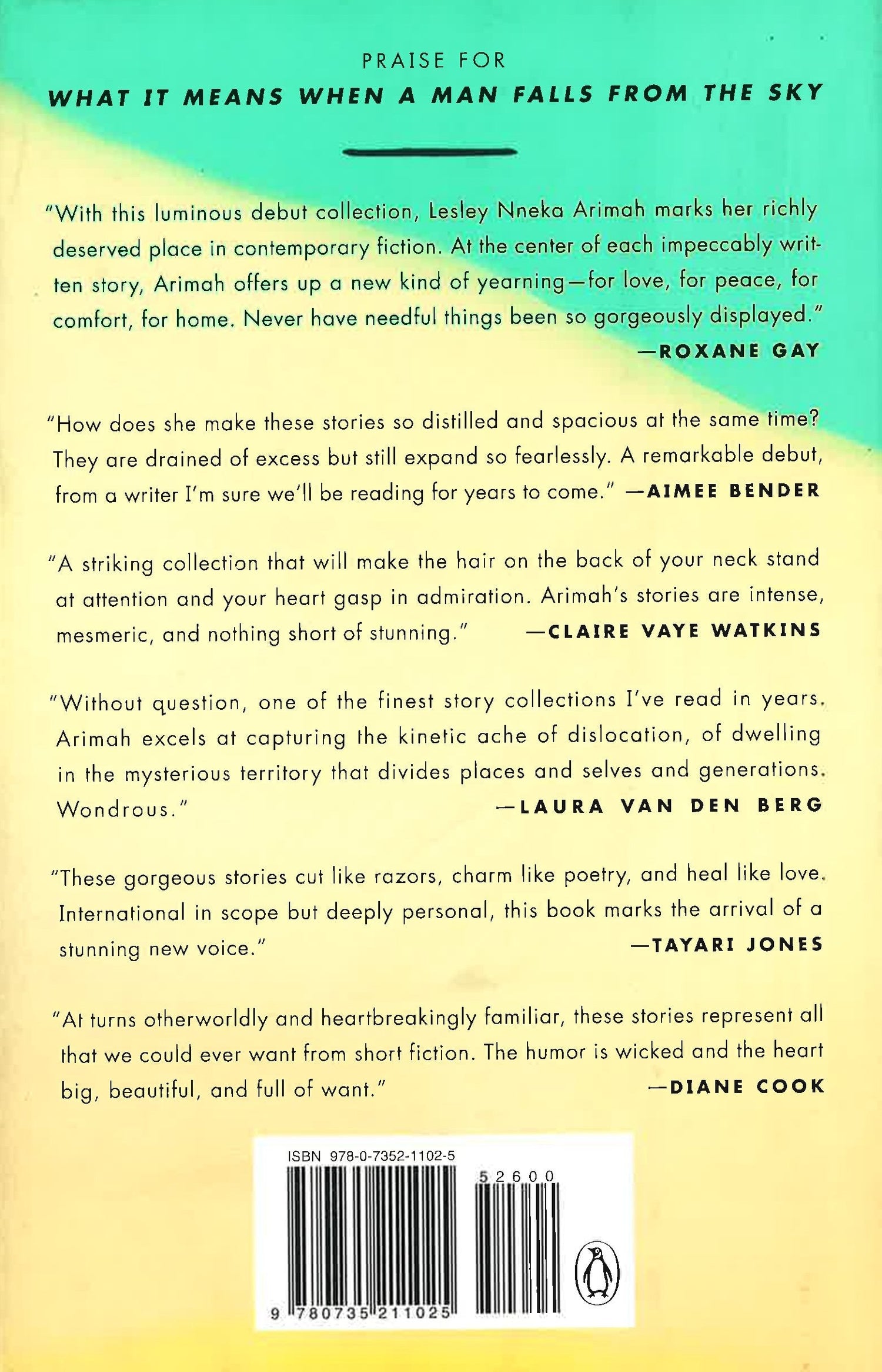 A dazzlingly accomplished debut collection explores the ties that bind parents and children, husbands and wives, lovers and friends to one another and to the places they call home. In "Who Will Greet You at Home," a National Magazine Award finalist for The New Yorker, A woman desperate for a child weaves one out of hair, with unsettling results. In "Wild," a disastrous night out shifts a teenager and her Nigerian cousin onto uneasy common ground. In "The Future Looks Good," three generations of women are haunted by the ghosts of war, while in "Light," a father struggles to protect and empower the daughter he loves. And in the title story, in a world ravaged by flood and riven by class, experts have discovered how to "fix the equation of a person" - with rippling, unforeseen repercussions. Evocative, playful, subversive, and incredibly human, What It Means When a Man Falls from the Sky heralds the arrival of a prodigious talent with a remarkable career ahead of her