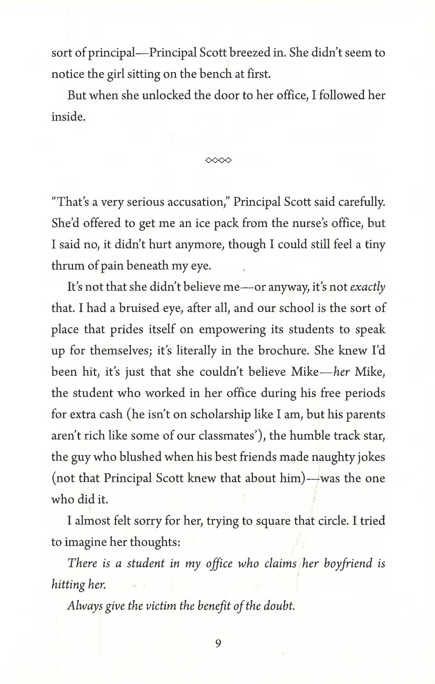 The girls at North Bay Academy are taking sides. It all started when Mike Parker's girlfriend showed up with a bruise on her face. Or, more specifically, when she walked into the principal's office and said Mike hit her. But her classmates have questions. Why did she go to the principal and not the police? Why did she stay so long if Mike was hurting her? Obviously, if it's true, Mike should be expelled. But is it true?