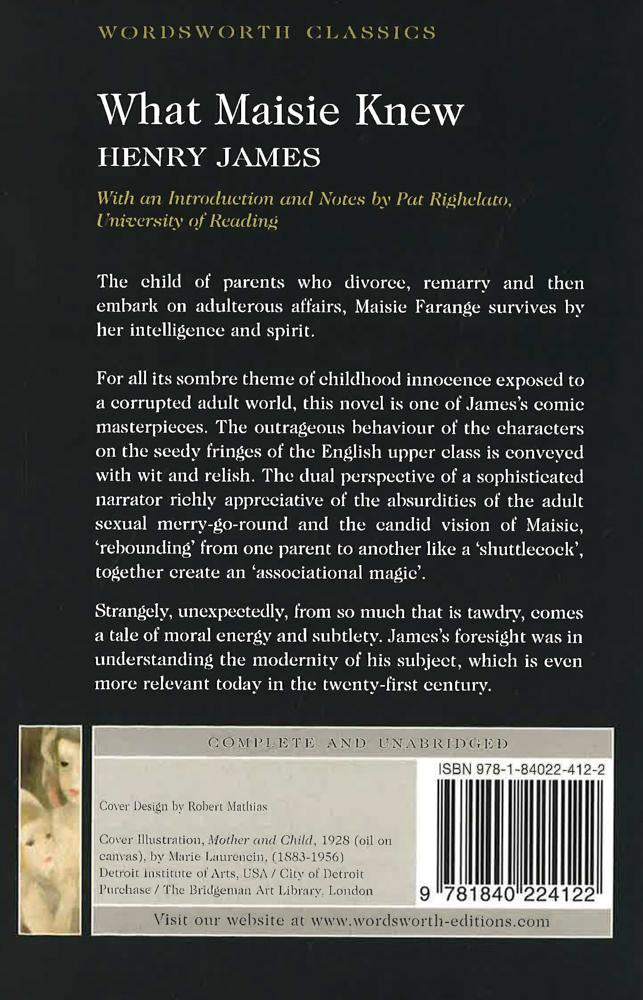 With an Introduction by Pat Righelato, University of Reading. The child of parents who divorce, remarry and then embark on adulterous affairs, Maisie Farange survives by her intelligence and spirit. For all its sombre theme of childhood innocence exposed to a corrupted adult world, this novel is one of James's comic masterpieces. The outrageous behaviour of the characters on the seedy fringes of the English upper class is conveyed with wit and relish. The dual perspective of a sophisticated narrator richly appreciative of the absurdities of the adult sexual merry-go-round and the candid vision of Maisie, 'rebounding' from one parent to another like a 'shuttlecock', together create an 'associational magic'. Strangely, unexpectedly, from so much that is tawdry, comes a tale of moral energy and subtlety. James's foresight was in understanding the modernity of his subject, which is even more relevant today in the twenty-first century.