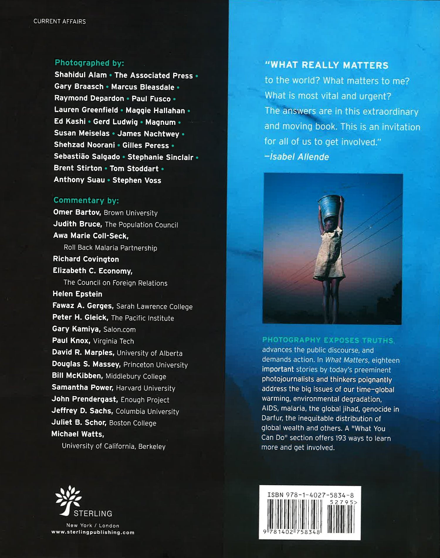 Photography has the ability to reveal truths, expose lies, advance public discourse and inspire people to demand change. Socially conscious pioneers with cameras have transformed the world - and that legacy lives on in this though provoking book. "What Matters" asks: What are the essential issues of our time? What are the pictures that will spark public outrage and spur reform? The answer appears in 18 powerful stories by the foremost photojournalists of our age, edited by "New York Times" best-selling author David Elliot Cohen and featuring trenchant commentary from well-recognised experts and thinkers.The combination of compelling photographs and insightful writing will make this a highly relevant, widely discussed book, bound to appeal to anyone concerned about the crucial issues afflicting our world from global warming to third world child labour. The volume also includes extensive "What You Can Do" sections with a menu of web links and effective actions readers can take now.