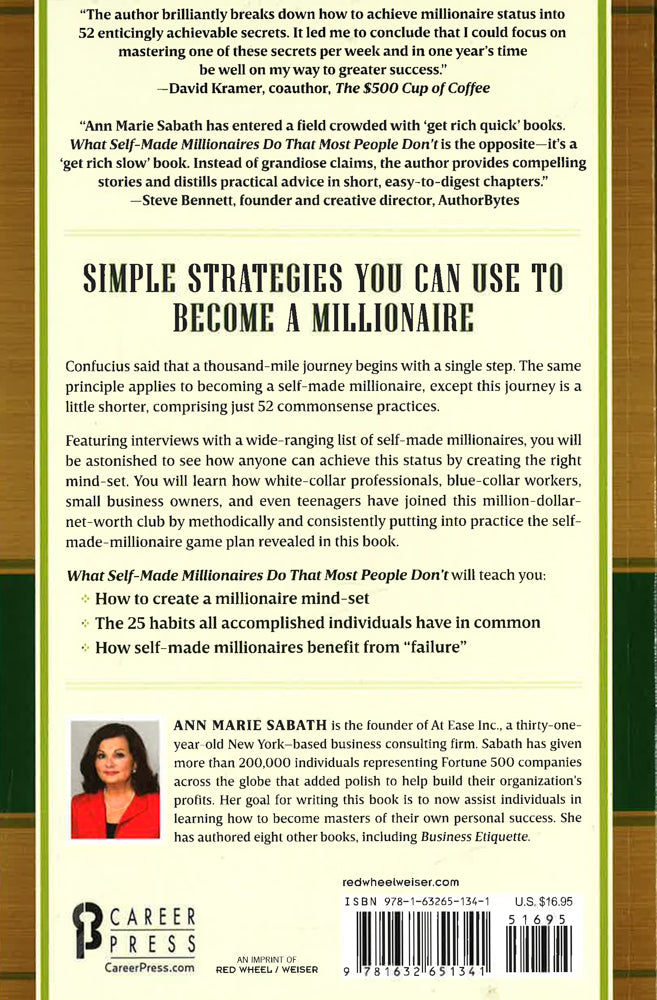 Confucius said that a thousand-mile journey begins with a single step. The same principle applies to becoming a self-made millionaire, except this journey is a little shorter, comprising just 52 common sense practices. Featuring interviews with a wide-ranging list of self-made millionaires, you will be astonished to see how anyone can achieve this status by creating the right mindset. You will learn how white-collar professionals, blue-collar workers, small business owners, even teenagers alike have joined this million-dollar net worth club by methodically and consistently putting into practice the self-made millionaire game plan revealed in this book. In What Self-Made Millionaires Do that Most People Don't, Ann Marie Sabath makes it easy for you to implement these simple strategies by posing a question at the end of each section to help you begin your own self-made millionaire journey. What Self-Made Millionaires Do that Most People Don't will teach you: