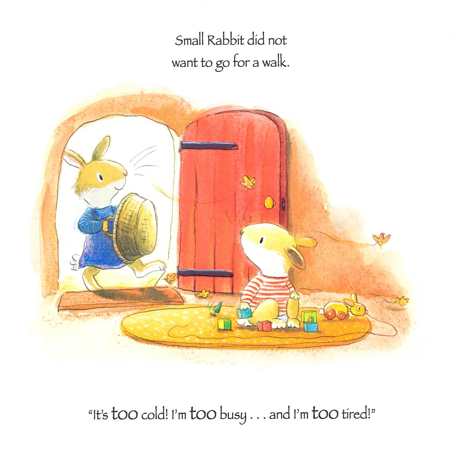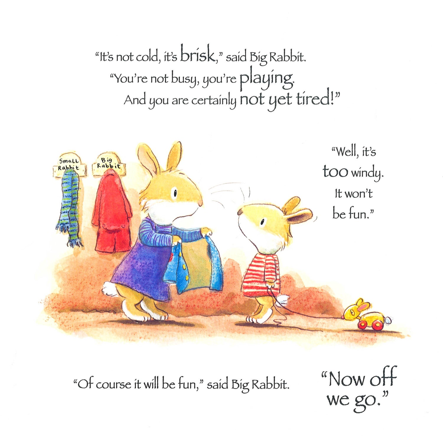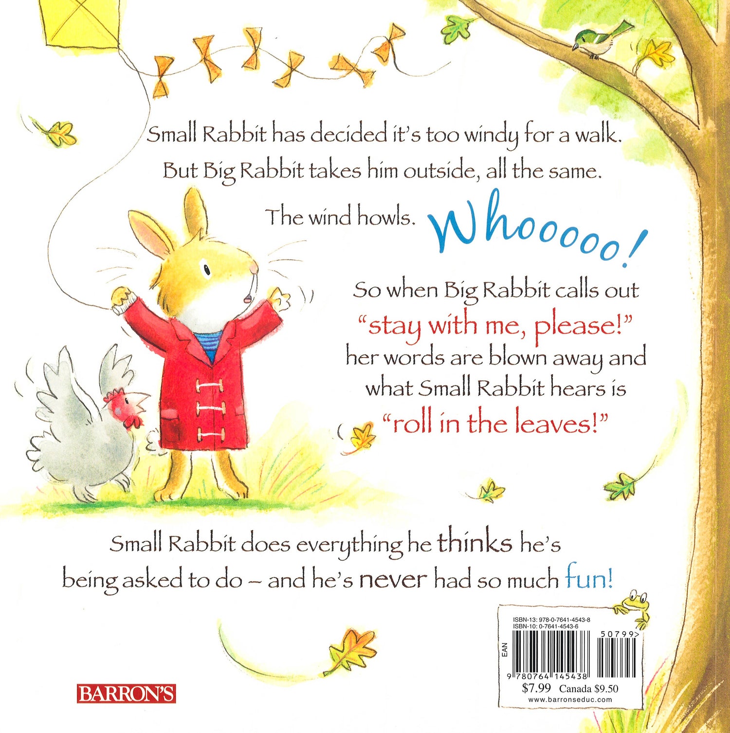 Small Rabbit and Big Rabbit are out walking on a very windy day. When Small Rabbit starts trailing behind, Big Rabbit cries out, " "Try to keep up."" But her words are lost in the howling wind, and Small Rabbit thinks that he hears, " "Jump in the mud." " So he jumps in the mud! As their hike continues, Small Rabbit does everything he " thinks " he is being asked to do. The trouble is, he never hears what Big Rabbit is really saying. But maybe it doesn't matter, because Small Rabbit is having lots of fun! Kids will love this funny story, and they'll delight in the comical color illustrations on every page.