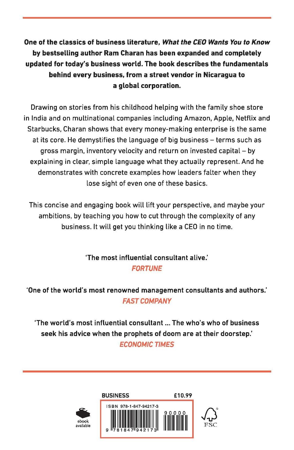 OVER 300,000 COPIES SOLD WORLDWIDE`The most influential consultant alive.' FortuneOne of the classics of business literature, What the CEO Wants You to Know by bestselling author Ram Charan has been expanded and completely updated for today's business world. OVER 300,000 COPIES SOLD WORLDWIDE `The most influential consultant alive.' Fortune One of the classics of business literature, What the CEO Wants You to Know by bestselling author Ram Charan has been expanded and completely updated for today's business world. The book describes the fundamentals behind every business, from a street vendor in Nicaragua to a global corporation. Drawing on stories from his childhood helping with the family shoe store in India and on multinational companies including Amazon, Apple, Netflix and Starbucks, Charan shows that every money-making enterprise is the same at its core. He demystifies the language of big business - terms such as gross margin, inventory velocity and return on invested capital - by explaining in clear, simple language what they actually represent. And he demonstrates with concrete examples how leaders falter when they lose sight of even one of these basics. This concise and engaging book will lift your perspective, and maybe your ambitions, by teaching you how to cut through the complexity of any business. It will get you thinking like a CEO in no time.