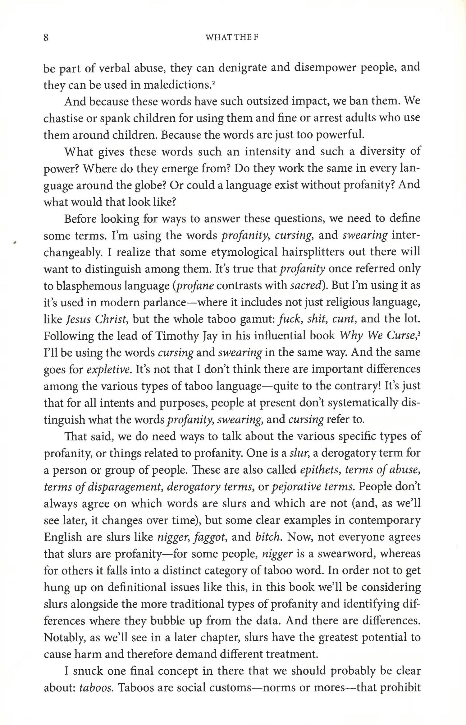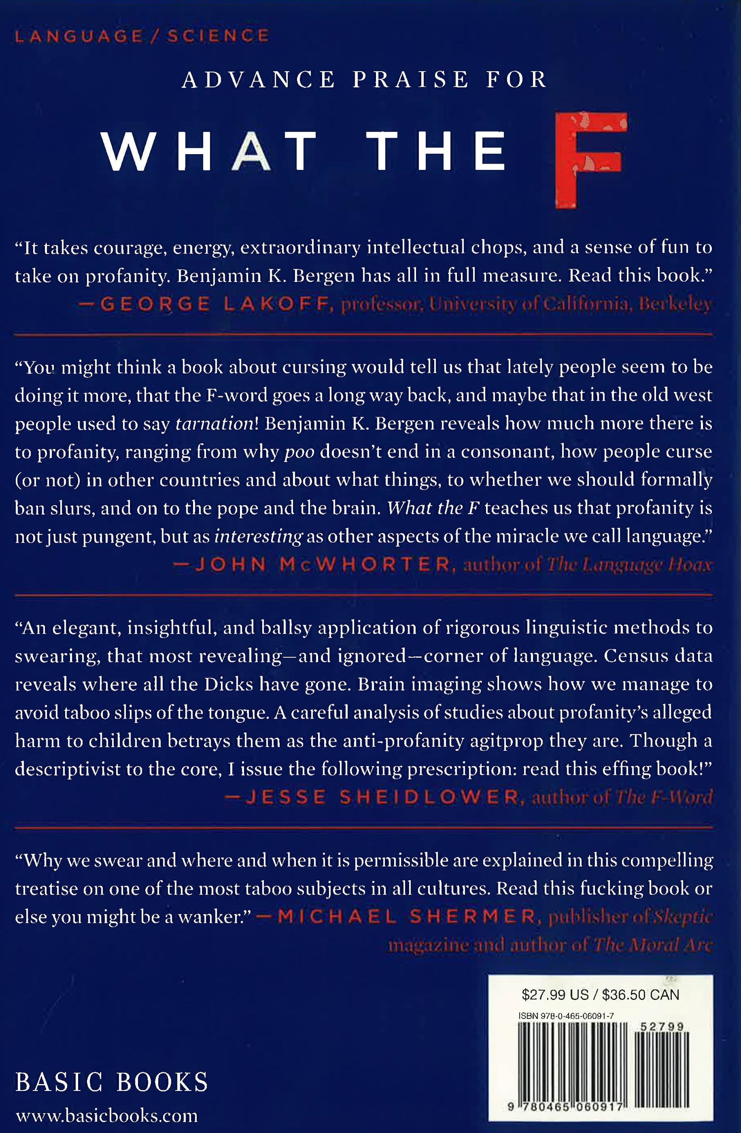 Nearly everyone swears,whether it's over a few too many drinks, in reaction to a stubbed toe, or in flagrante delicto. And yet, we sit idly by as words are banned from television and censored in books. We insist that people excise profanity from their vocabularies and we punish children for yelling the very same dirty words that we'll mutter in relief seconds after they fall asleep. Swearing, it seems, is an intimate part of us that we have decided to selectively deny.That's a damn shame. Swearing is useful. It can be funny, cathartic, or emotionally arousing. As linguist and cognitive scientist Benjamin K. Bergen shows us, it also opens a new window onto how our brains process language and why languages vary around the world and over time. In this ground-breaking yet ebullient romp through the linguistic muck, Bergen answers intriguing questions: How can patients left otherwise speechless after a stroke still shout Goddamn! when they get upset? When did a cock grow to be more than merely a rooster? Why is crap vulgar when poo is just childish? Do slurs make you treat people differently? Why is the first word that Samoan children say not mommy but eat shit ? And why do we extend a middle finger to flip someone the bird?Smart as hell and funny as fuck, What the F is mandatory reading for anyone who wants to know how and why we swear.