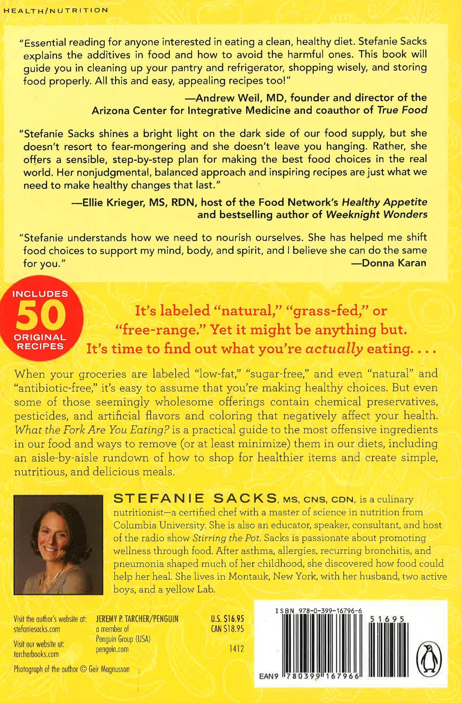 When your groceries are labeled "low-fat," "sugar-free," and even "natural" and antibiotic-free, it's easy to assume that you're making healthy choices. Yet even some of those seemingly wholesome offerings contain chemical preservatives, pesticides, and artificial flavors and coloring that negatively affect your health. In What the Fork Are You Eating?, a practical guide written by certified chef and nutritionist Stefanie Sacks, MS, CNS, CDN, we learn exactly what the most offensive ingredients in our food are and how we can remove (or at least minimize) them in our diets. Sacks gives us an aisle-by-aisle rundown of how to shop for healthier items and create simple, nutritious, and delicious meals, including fifty original recipes.