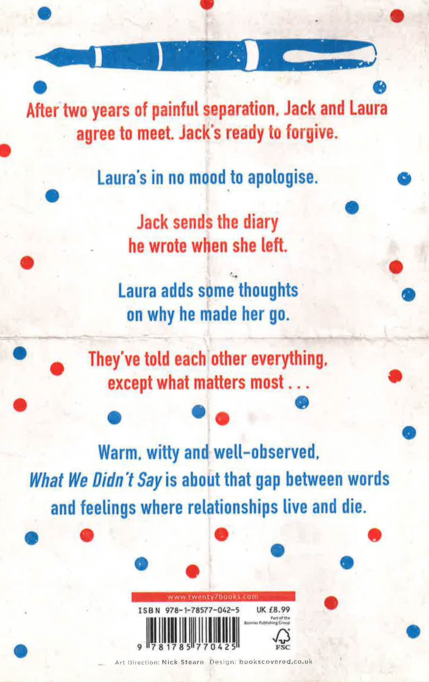 A darkly funny story of a marriage in crisis, perfect for readers who loved Us by David Nicholls and The Versions of Us by Laura Barnett 'A touching, even-handed and thoroughly engaging tale of love, jealousy and fatherhood' Jim Crace, multi-award-winning author of Harvest Jack and Laura have separated. Jack thinks it's all Laura's fault. Laura disagrees. Jack writes to Laura, desperate to put across his side of the story. Laura interrupts. Wryly sarcastic and intensely well-observed, What We Didn't Say is about that gap between words and feelings where relationships live - and die.