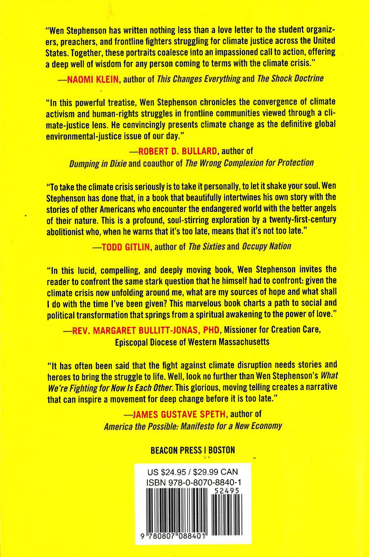 An urgent, on-the-ground look at some of the "new American radicals" who have laid everything on the line to build a stronger climate justice movement The science is clear: catastrophic climate change, by any humane definition, is upon us. At the same time, the fossil-fuel industry has doubled down, economically and politically, on business as usual. We face an unprecedented situation--a radical situation. As an individual of conscience, how will you respond? In 2010, journalist Wen Stephenson woke up to the true scale and urgency of the catastrophe bearing down on humanity, starting with the poorest and most vulnerable everywhere, and confronted what he calls "the spiritual crisis at the heart of the climate crisis." Inspired by others who refused to retreat into various forms of denial and fatalism, he walked away from his career in mainstream media and became an activist, joining those working to build a transformative movement for climate justice in America. In What We're Fighting for Now Is Each Other, Stephenson tells his own story and offers an up-close, on-the-ground look at some of the remarkable and courageous people--those he calls "new American radicals"--who have laid everything on the line to build and inspire this fast-growing movement: old-school environmentalists and young climate-justice organizers, frontline community leaders and Texas tar-sands blockaders, Quakers and college students, evangelicals and Occupiers. Most important, Stephenson pushes beyond easy labels to understand who these people really are, what drives them, and what they're ultimately fighting for. He argues that the movement is less like environmentalism as we know it and more like the great human-rights and social-justice struggles of the nineteenth and twentieth centuries, from abolitionism to civil rights. It's a movement for human solidarity. This is a fiercely urgent and profoundly spiritual journey into the climate-justice movement at a critical moment--in search of what climate justice, at this late hour, might yet mean. *This book may have remainder mark*