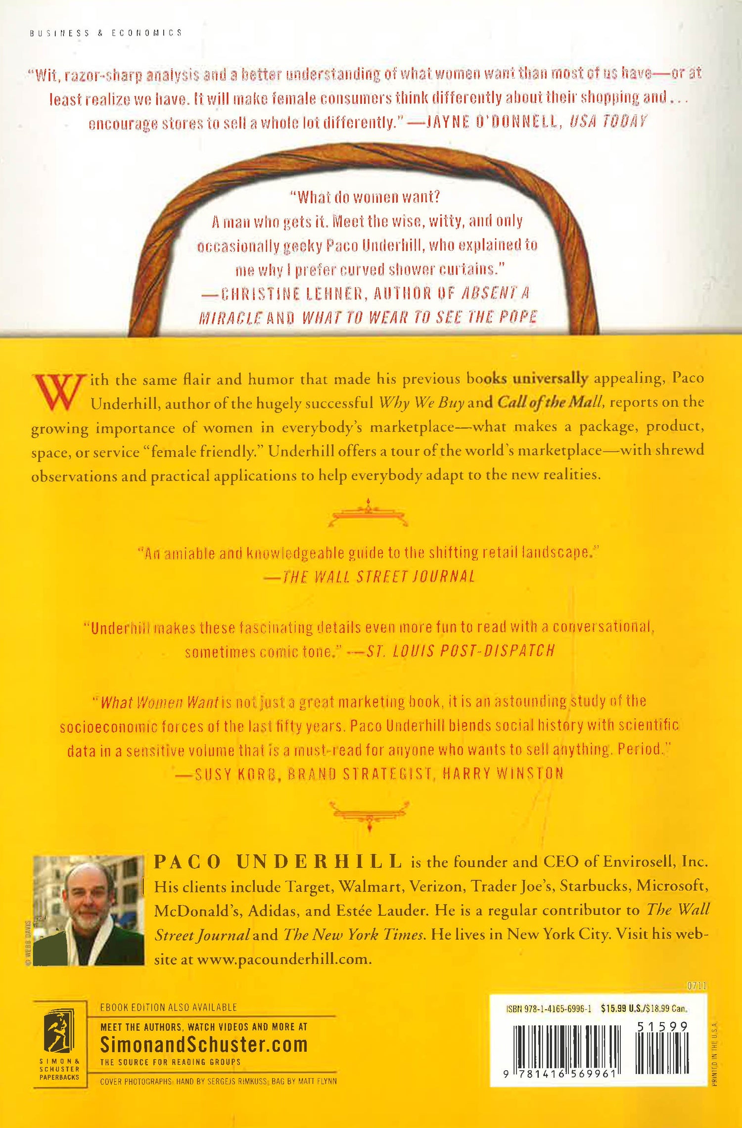 With the same flair and humor that made his previous books universally appealing, Paco Underhill, author of the hugely successful Why We Buy and Call of the Mall, reports on the growing importance of women in everybody's marketplace - what makes a package, product, space, or service "female friendly." Underhill offers a tour of the world's marketplace - with shrewd observations and practical applications to help everybody adapt to the new realities.