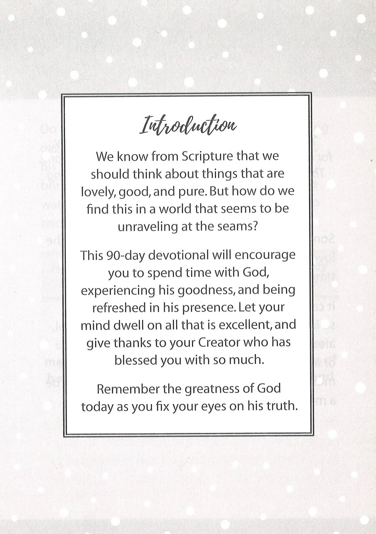 We know from Scripture that we should think about things that are lovely, good, and pure. But how do we find this in a world that seems to be unraveling at the seams? This 90-day devotional will encourage you to spend time with God, experiencing his goodness, and being refreshed in his presence. Let your mind dwell on all that is excellent, and give thanks to your Creator who has blessed you with so much. Remember the greatness of God today as you fix your eyes on his truth.
