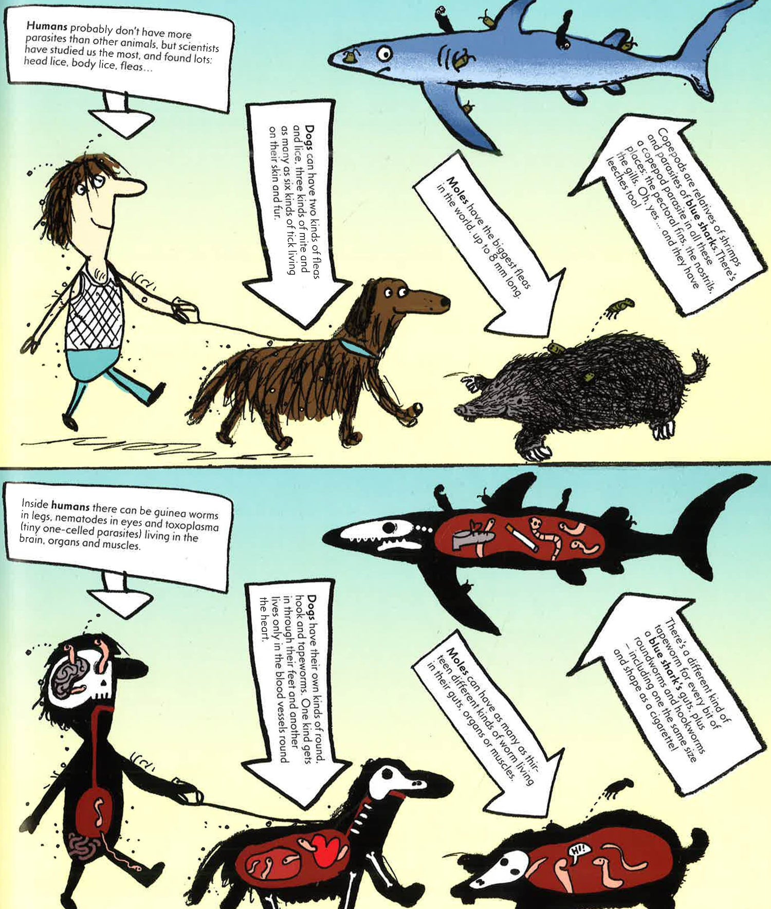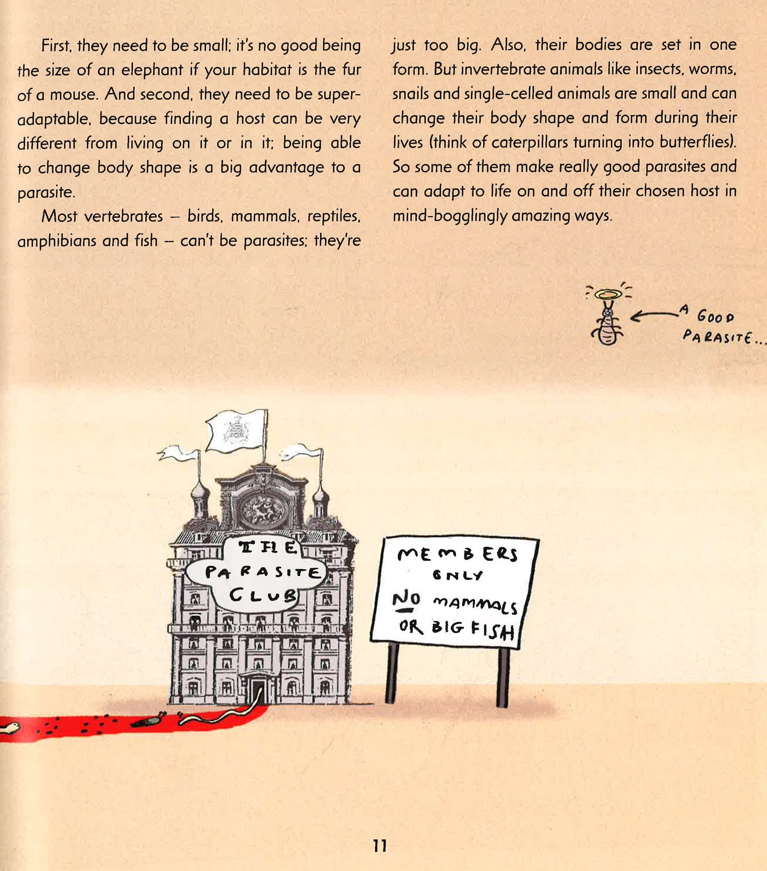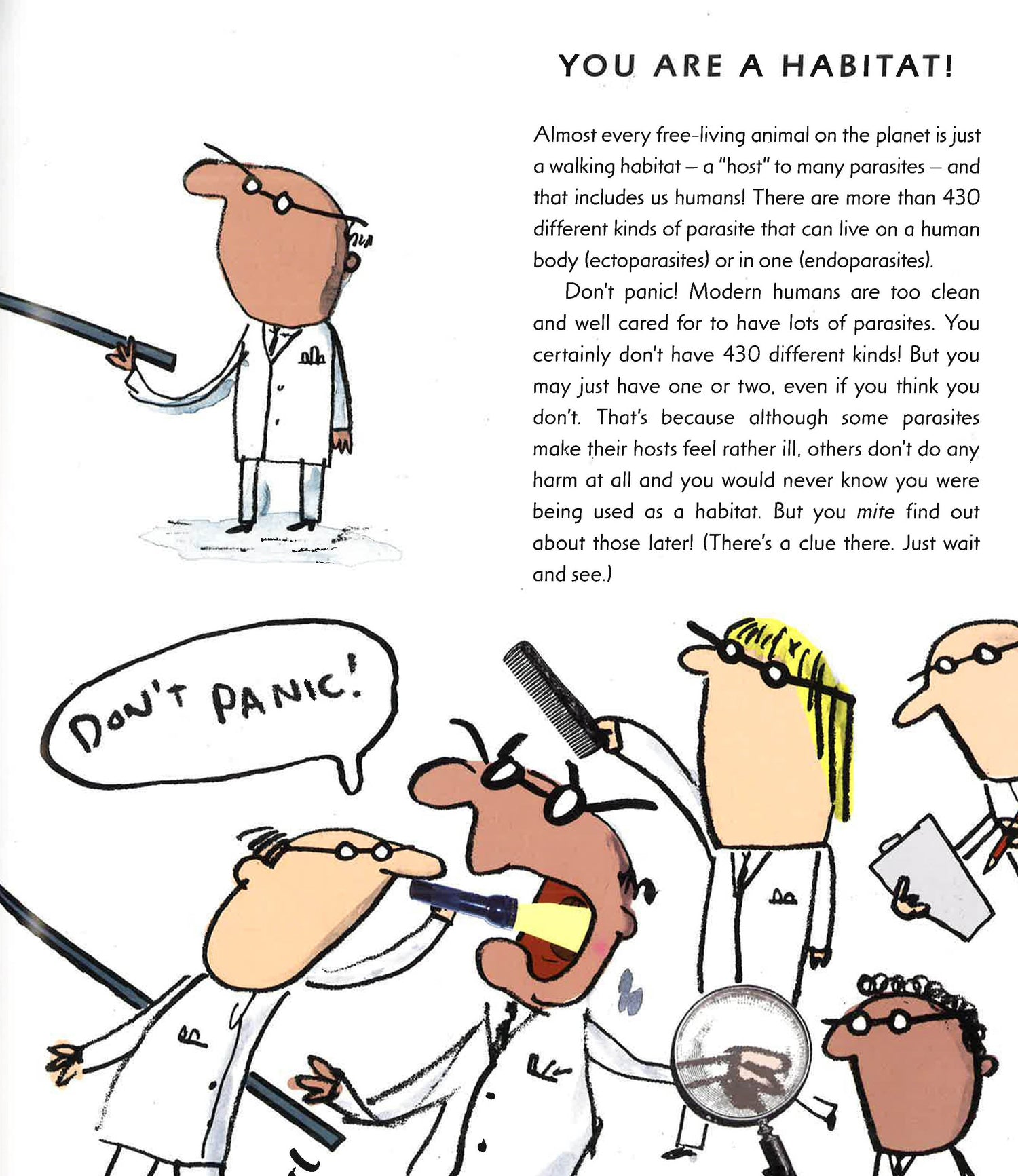 An exciting new edition of one of the six books in zoologist Nicola Davies' fascinating Animal Science series - the best biology series ever! Every animal has a habitat where it can find food and shelter and have its babies. But there is one group of creatures whose habitats are not forests, seas or deserts. Instead they live on or in the bodies of other animals - in skin, hair, fur, feathers, blood, guts, livers, hearts and lungs. They are parasites. Uncover the secrets of their amazing life-cycles and dare yourself not to scratch or groan as you read ... then give in; it's impossible! Short written sections with creepy-crawly diagrams and comic strips by Neal Layton make this information book engaging and accessible for young minds.