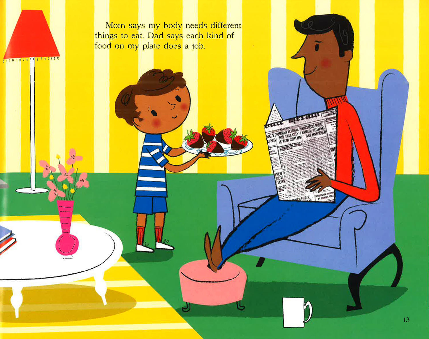 What's for lunch? Your body needs lots of different things to eat, and every kind of food has a different job to do! Did you know drinking milk makes your bones strong? Or that eating carrots helps you see better? Read and find out about the different kinds of food we eat and how to fill up your plate to keep your body healthy!