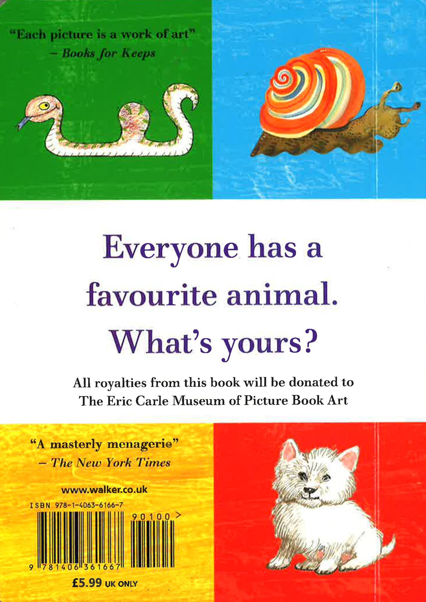 From the creator of The Very Hungry Caterpillar comes a stylish first animal board book - perfect for babies and their picture book-loving parents! Who would have thought Lucy Cousins' favourite animal is a leopard, NOT a mouse! And Eric Carle? He loves CATS! Bringing together some of the finest modern children's book illustrators of our time - Jon Klassen, Eric Carle, Lucy Cousins, Nick Bruel, Susan Jeffers, Steven Kellogg, Tom Litchtenheld, Peter McCarty, Chris Raschka, Peter Sis, Lane Smith, Erin Stead, Rosemary Wells, Mo Willems - Eric Carle asks, "What's your favourite animal?" and the result is an astonishingly colourful parade of animals, from giraffes with their heads in the clouds to fuzzy dogs and squishy snails.