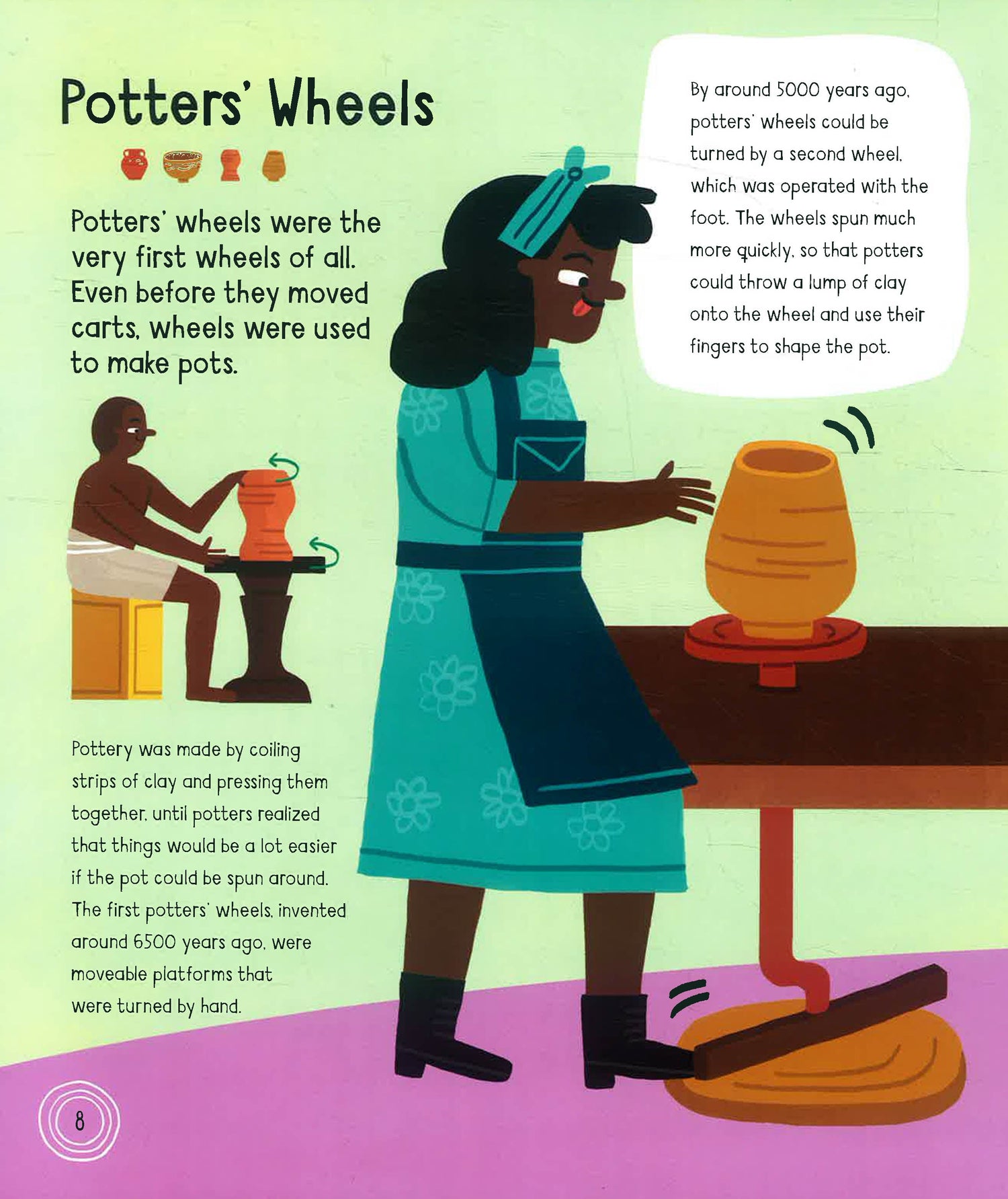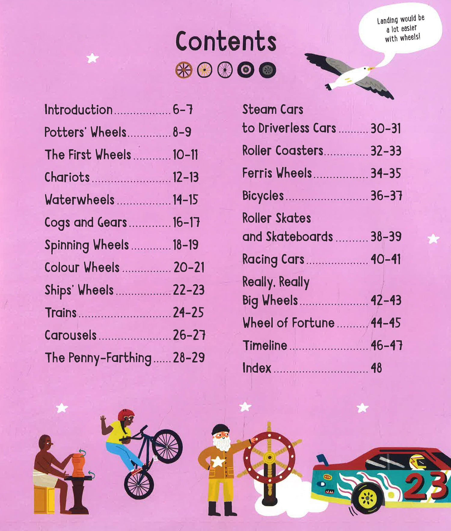 Discover how wheels make the world go round! Written by Tracey Turner, this fact-packed book takes young readers on a colourful journey through the subject of wheels of all kinds, from Roman chariots to driverless cars, via rollercoasters, cogs and gears, monster trucks and much more.