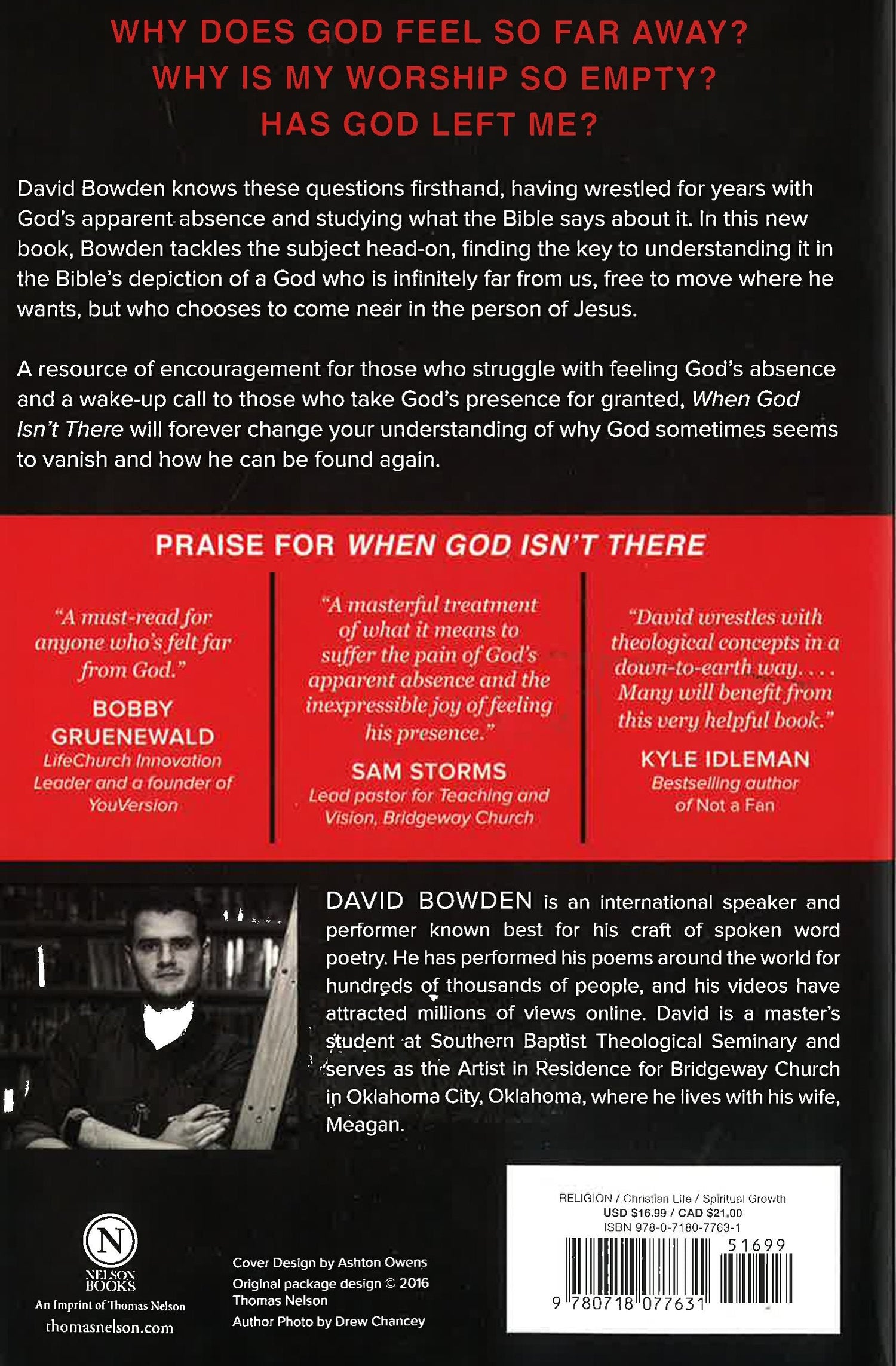 Why does God feel so far away? Why is my worship so empty? Has God left me?David Bowden knows these questions firsthand, having wrestled for years with God?s apparent absence and studying what the Bible says about it. In this new book, Bowden tackles the subject head-on, finding the key to understanding it in the Bible?s depiction of a God who is infinitely far from us, free to move where he wants, but who chooses to come near in the person of Jesus.A resource of encouragement for those who struggle with feeling God?s absence and a wake-up call to those who take God?s presence for granted, When God Isn?t There will forever change your understanding of why God sometimes seems to vanish and how he can be found again.