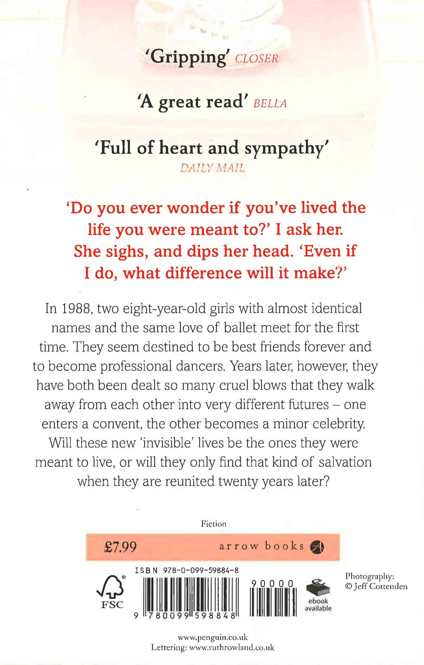 'Do you ever wonder if you've lived the life you were meant to?' I ask her. She sighs, and dips her head. Will these new, 'invisible' lives be the ones they were meant to live, or will they only find that kind of salvation when they are reunited twenty years later? 'Do you ever wonder if you've lived the life you were meant to?' I ask her. She sighs, and dips her head. 'Even if I do, what difference will it make?'In 1988, two eight-year-old girls with almost identical names and the same love of ballet meet for the first time. They seem destined to be best friends forever and to become professional dancers. Years later, however, they have both been dealt so many cruel blows that they walk away from each other into very different futures - one enters a convent, the other becomes a minor celebrity. Will these new, 'invisible' lives be the ones they were meant to live, or will they only find that kind of salvation when they are reunited twenty years later?