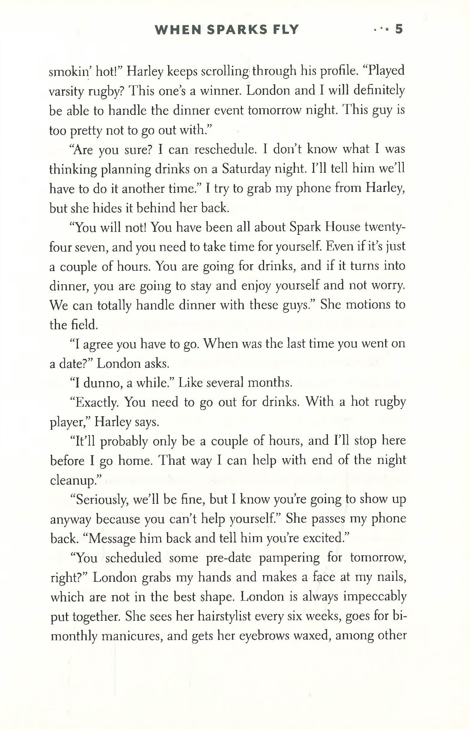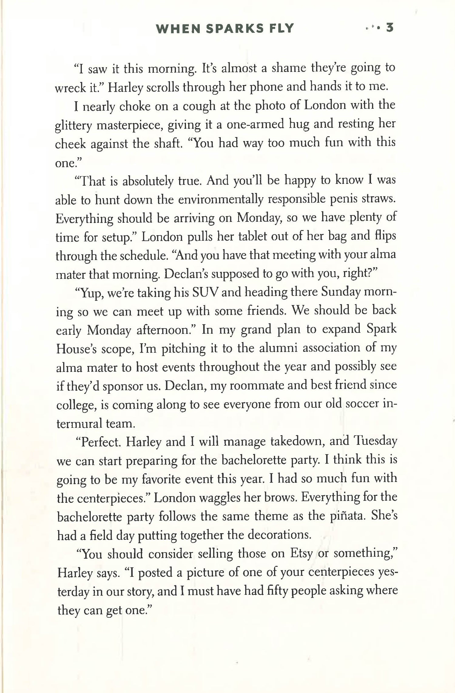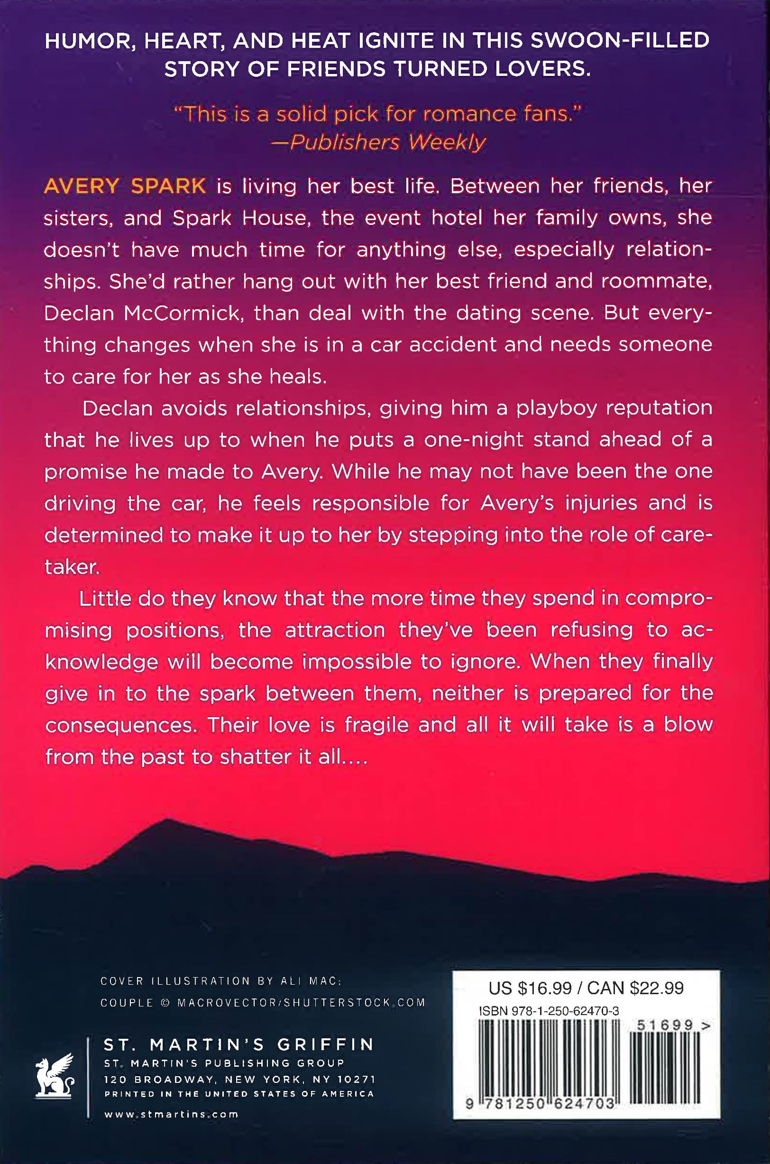 Avery Spark is living her best life. Between her friends, her sisters, and Spark House, the event hotel her family owns, she doesn’t have much time for anything else, especially relationships. She’d rather hang out with her best friend and roommate, Declan McCormick, than deal with the dating scene. But everything changes when she is in a car accident and needs someone to care for her as she heals.