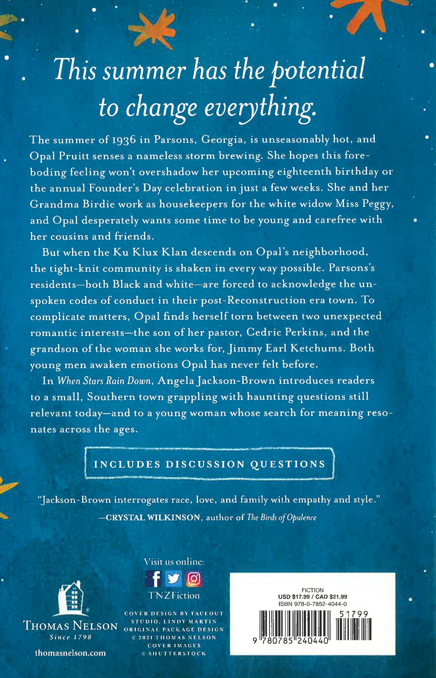 In When Stars Rain Down, Angela Jackson-Brown introduces readers to a small, Southern town grappling with haunting questions still relevant today—and to a young woman whose search for meaning resonates across the ages.