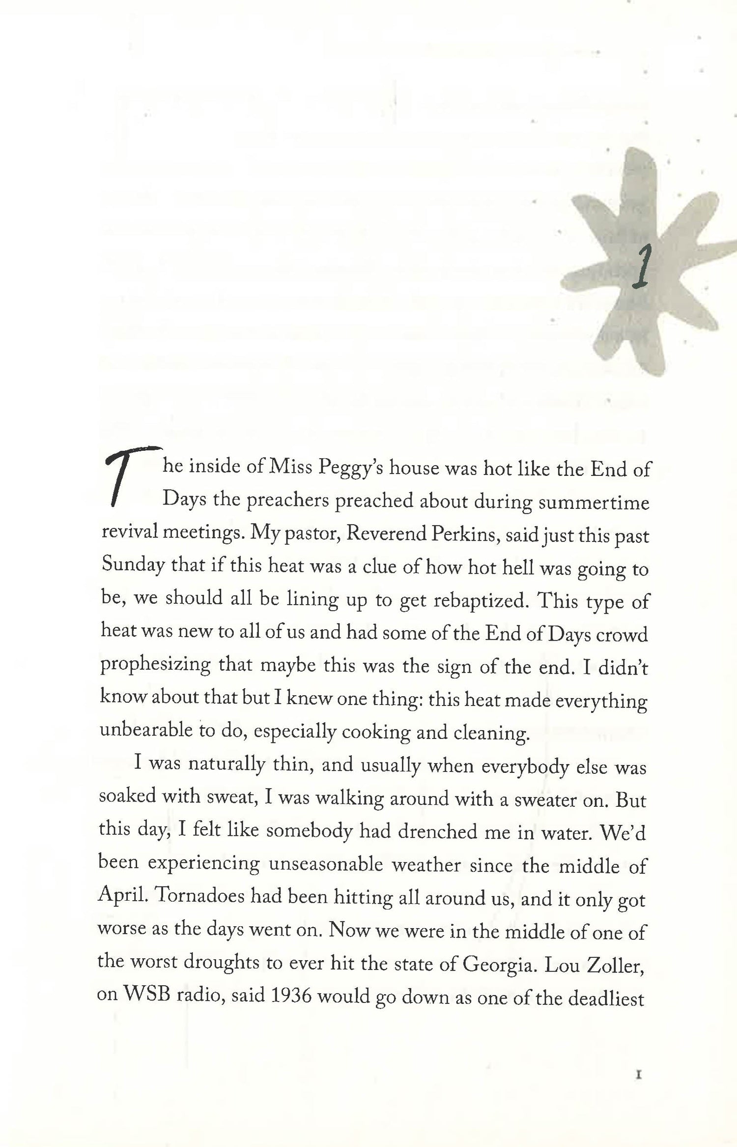 The summer of 1936 in Parsons, Georgia, is unseasonably hot, and Opal Pruitt senses a nameless storm brewing. She hopes this foreboding feeling won’t overshadow her upcoming eighteenth birthday or the annual Founder’s Day celebration in just a few weeks. She and her Grandma Birdie work as housekeepers for the white widow Miss Peggy, and Opal desperately wants some time to be young and carefree with her cousins and friends.