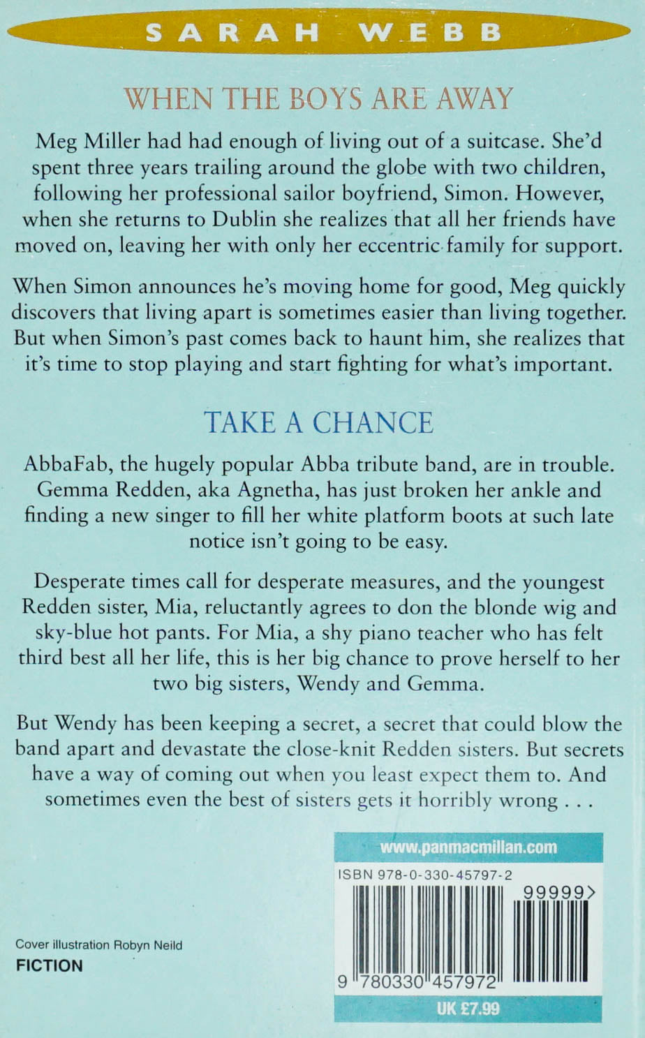 When the Boys Are Away... When Meg returns to Dublin after three years trailing Simon around the globe with their toddler, Lily and Dan, her 11 year old son from a previous relationship in tow, she realises that all her friends have moved on. Now she only has her kooky family, her sex-obsessed sister, Hattie and Dan's flaky but dangerously gorgeous father, Sid, to rely on for help and support. Her new neighbour, Tina is in the same boat. Tina's a work widow. Her workaholic husband, Oliver, works in London from Monday to Friday, leaving Tina with only her permanently stressed sister, Gerry, for company during the week. Meg is worried. Without Simon's job to define her, she doesn't know who she is any more. But just when she finds a new job and starts to get back on her feet, Simon throws her another curve ball. Meg finds that having a man around all the time isn't all it's cracked up to be and that sometimes living apart is easier than living together. Because when the boys are away ...the girls can play! Take A Chance 'Abbafab', the hugely popular Abba tribute band are in trouble. Gemma Redden has just broken her ankle and finding a new singer to fill her white platform boots at such late notice isn't going to be easy. But desperate times call for desperate measures and the youngest Redden sister, Mia, reluctantly agrees to don the blonde wig and sky blue hot pants. For Mia, a shy piano teacher who has felt third best all her life, this is her big chance to prove herself to her two older sisters, Gemma and Wendy. Meanwhile, Mia's oldest friend, Alva Ryan, is having a life crisis of her own. Her builder boyfriend and all round good guy, Sean Malone, has just walked out and this time he swears he's not coming back. Alva's sister, Kerry, is having rather unusual problems of her own. Things come to a head when Wendy has a terrible accident. Wendy is harbouring a secret that could blow the band apart and devastate the close bond of the Redden sisters. But secrets have a way of coming out when you least expect them to. Sometimes even the best of sisters gets it horribly wrong. *This book may have minor shelfwear.