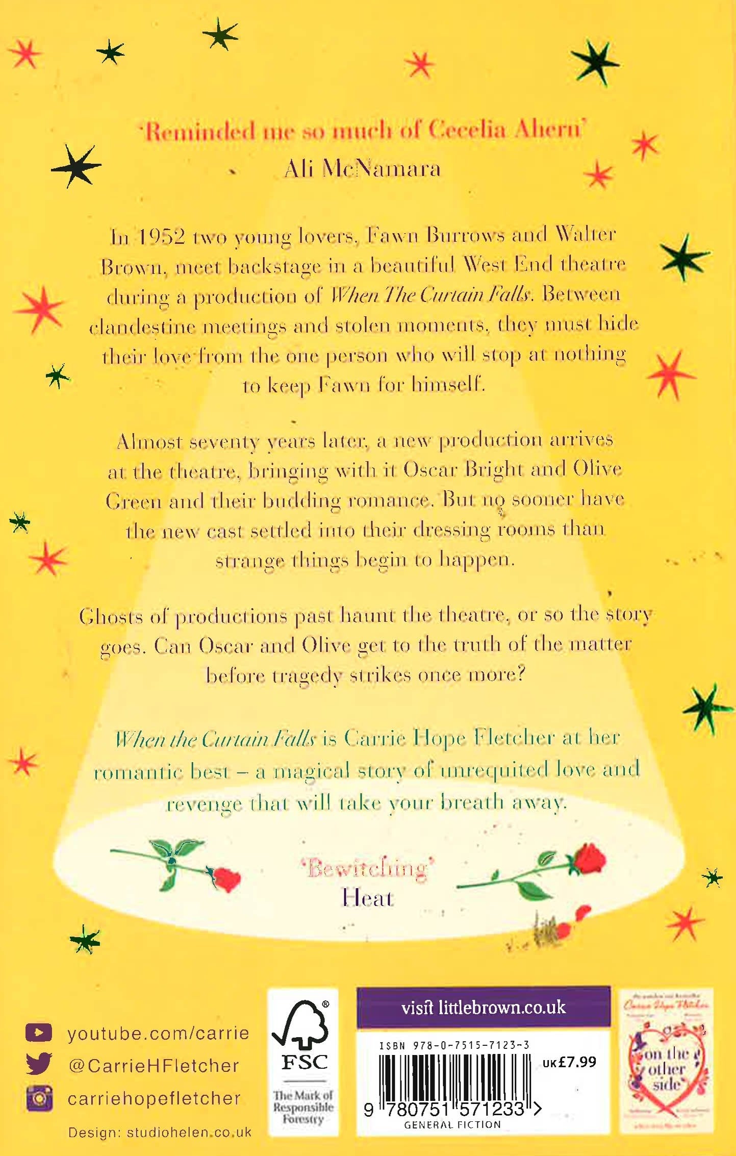 The TOP FIVE Sunday Times Bestseller ***PLUS Carrie's BRAND-NEW novel In The Time We Lost is available to PRE-ORDER now*** 'Enchanting, evocative and utterly magical.. I LOVED this book!' MIRANDA DICKINSON 'A brilliant book' LOUISE PENTLAND 'Bewitching' HEAT ****** Theatres have a certain kind of magic. When the curtain rises, we are all enraptured by the glare of the lights and the smell of the greasepaint but it's when the curtain falls that the real drama begins . . . In 1952 two young lovers meet, in secret, at the beautiful Southern Cross theatre in the very heart of London's West End. Their relationship is made up of clandestine meetings and stolen moments because there is someone who will make them suffer if he discovers she is no longer 'his'. But life in the theatre doesn't always go according to plan and tragedy and heartache are waiting in the wings for all the players . . . Almost seventy years later, a new production of When the Curtain Falls arrives at the theatre, bringing with it Oscar Bright and Olive Green and their budding romance. Very soon, though, strange things begin to happen and they learn about the ghost that's haunted the theatre since 1952, a ghost who can only be seen on one night of the year. Except the ghost is appearing more often and seems hell bent on sabotaging Oscar and Olive. The young couple realise they need to right that wrong from years gone by, but can they save themselves before history repeats itself and tragedy strikes once more? Moulin Rouge meets Phantom of the Opera in this spellbinding and magical story of unrequited love and revenge. When the Curtain Falls is Carrie Hope Fletcher at her romantic best - it will take your breath away.