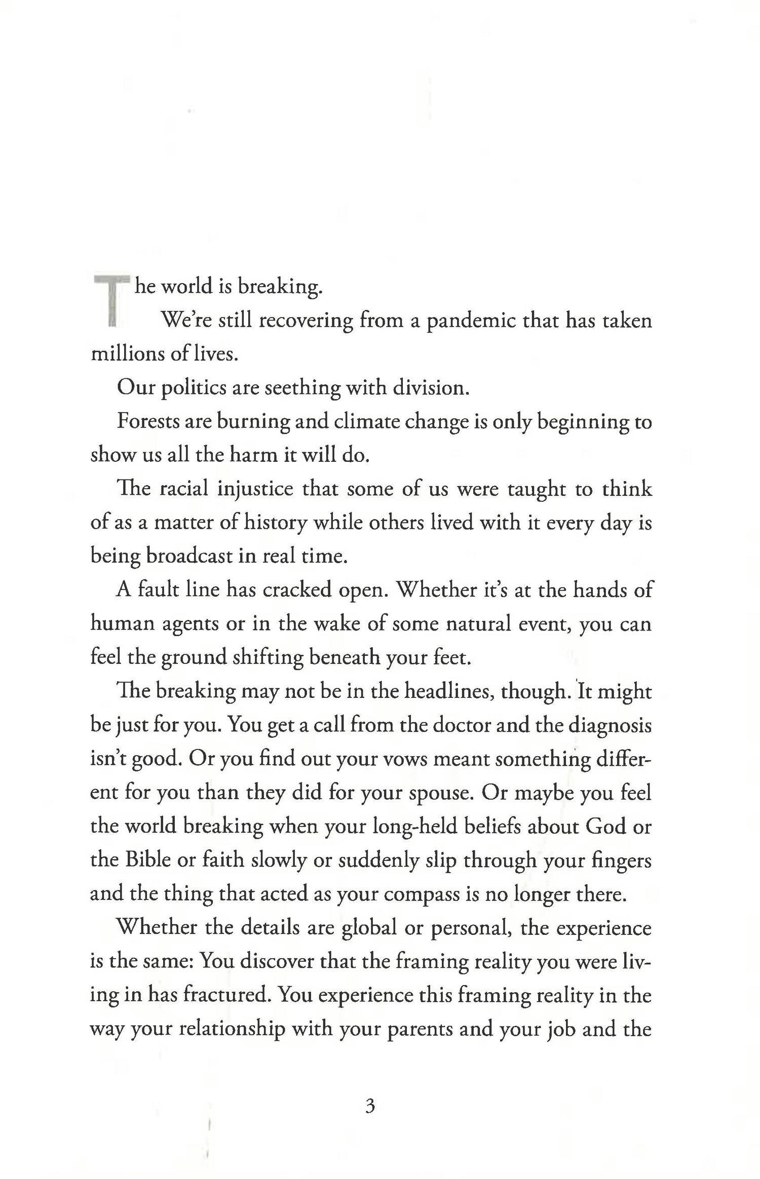 This book is about what happens when the fundamental picture we had relied on - our sense of how everything holds together - falls apart. For some, this moment comes when a global pandemic upends our security. For others, it's a partner leaving, or a terrible diagnosis, or the death of a loved one. Many of us have felt our worlds breaking when long-held beliefs about God or faith slipped through our hands. Whether the details are global or personal, the experience is the same: you discover that the framing reality you were living in has fractured.