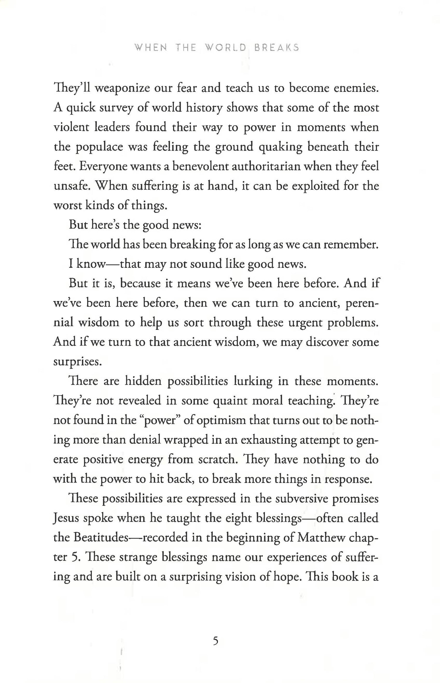But here's the good news: The world has been breaking for as long as we can remember. We've been here before, which means we can turn to ancient, perennial wisdom to help us sort through these urgent problems. In When the World Breaks, Jason Adam Miller explores the possibilities for hope hidden in the paradoxes Jesus spoke when he taught the eight blessings - often called the Beatitudes - recorded in the beginning of Matthew chapter 5. These strange blessings name our experiences of suffering and are built on a particular kind of hope. This book is a meditation on those teachings as a transformative way forward when we suffer.