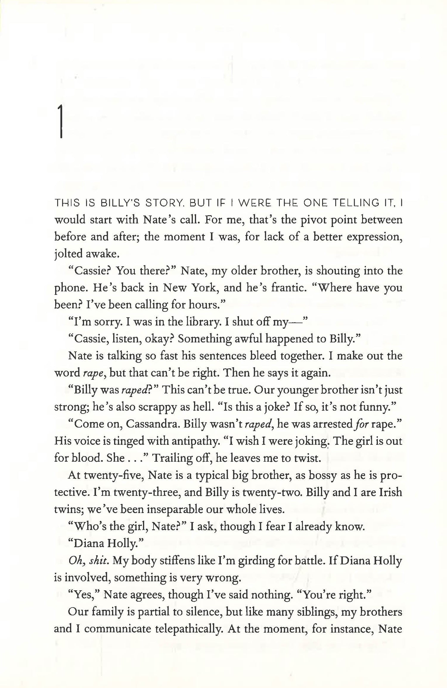 When Billy, a junior at Princeton, is arrested for assaulting his ex-girlfriend, Cassie races home to Manhattan to join forces with her big brother Nate and their parents, Lawrence and Eleanor. The Quinns scramble to hire the best legal minds money can buy, but Billy fits the all-too-familiar sex-offender profile―white, athletic, and privileged―that makes headlines and sways juries.