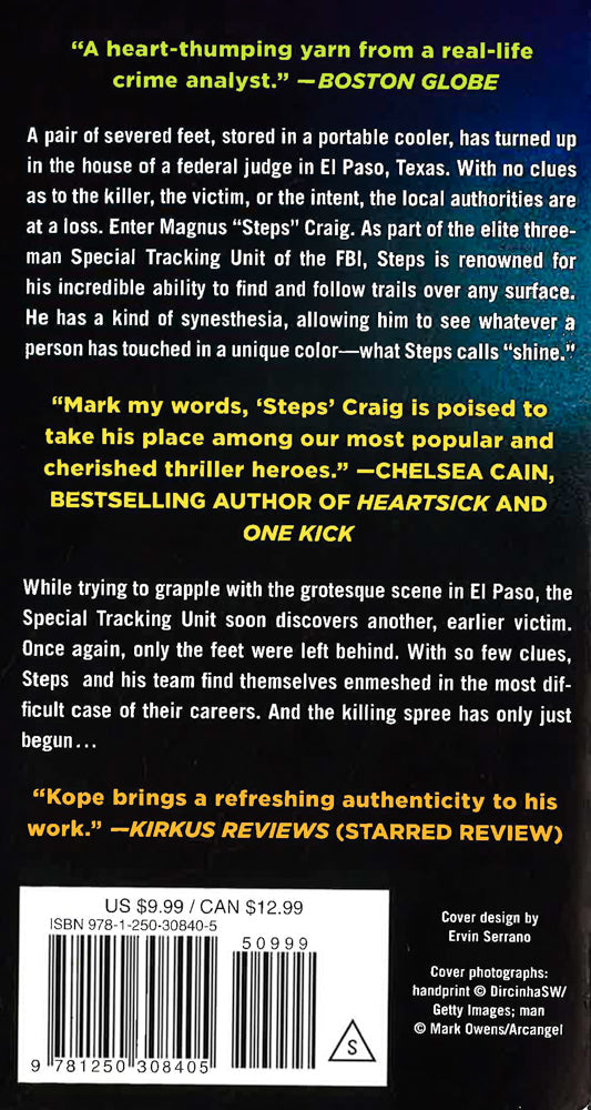 There has been a murder, but not only is the identity of the victim unknown, most of the body itself is missing. All that’s been found is a pair of feet, stored in a cooler, and left in the house of a judge in Texas. All the authorities know is that this likely isn’t the killer’s first - or his last - victim. Magnus “Steps” Craig is an FBI agent and an elite tracker. As part of the three-man special team, FBI’s Special Tracking Unit, he is called in on cases where his skills are indispensable. Steps has a kind of synesthesia, an ability that allows him to see whatever each particular person has touched in a unique colour - what Steps calls `shine.’ They soon discover another, earlier victim, killed in the same way. With almost no clues, Steps and his team find themselves enmeshed in the most difficult case of their careers. And The Icebox Killer has only just begun.