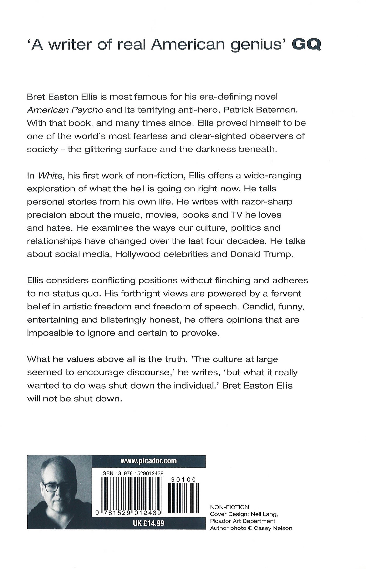 Bret Easton Ellis is most famous for his era-defining novel American Psycho and its terrifying anti-hero, Patrick Bateman. With that book, and many times since, Ellis proved himself to be one of the world's most fearless and clear-sighted observers of society - the glittering surface and the darkness beneath.In White, his first work of non-fiction, Ellis offers a wide-ranging exploration of what the hell is going on right now. He tells personal stories from his own life. He writes with razor-sharp precision about the music, movies, books and TV he loves and hates. He examines the ways our culture, politics and relationships have changed over the last four decades. He talks about social media, Hollywood celebrities and Donald Trump. Ellis considers conflicting positions without flinching and adheres to no status quo. His forthright views are powered by a fervent belief in artistic freedom and freedom of speech. Candid, funny, entertaining and blisteringly honest, he offers opinions that are impossible to ignore and certain to provoke. What he values above all is the truth. 'The culture at large seemed to encourage discourse,' he writes, 'but what it really wanted to do was shut down the individual.' Bret Easton Ellis will not be shut down.
