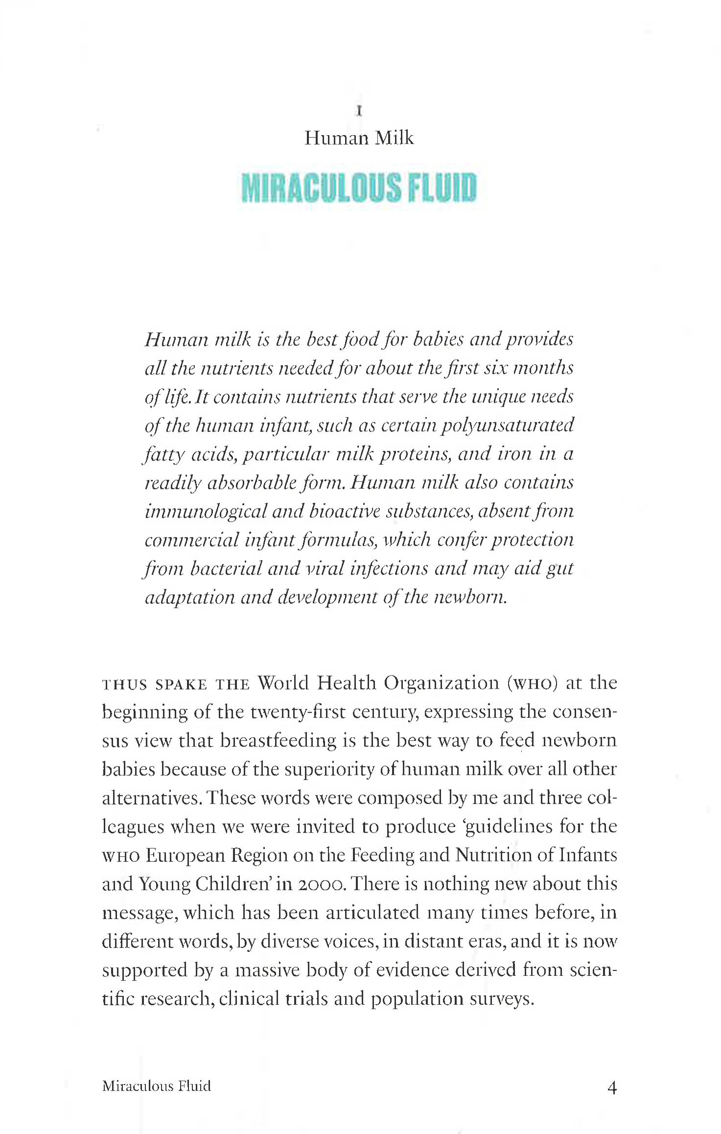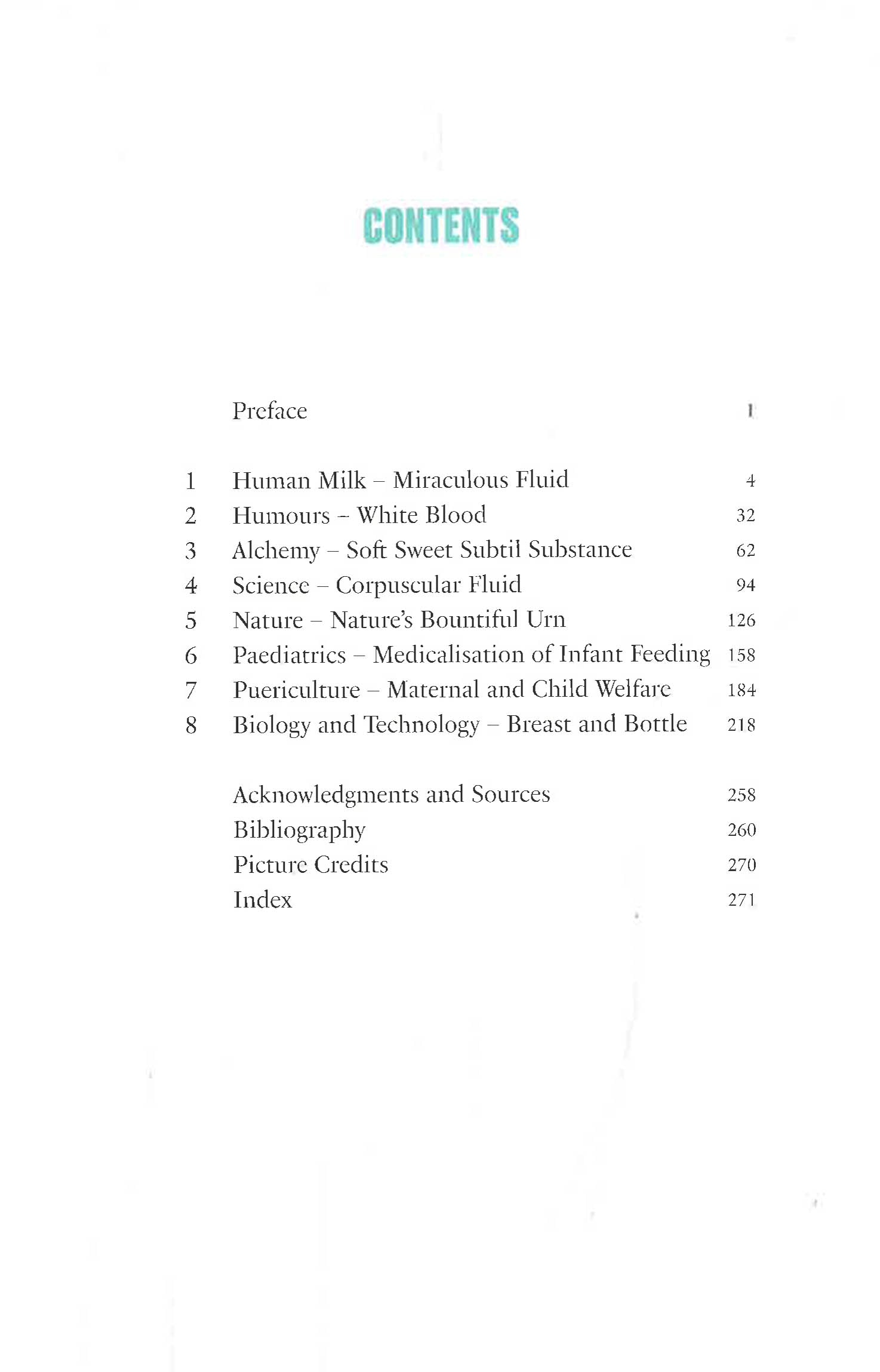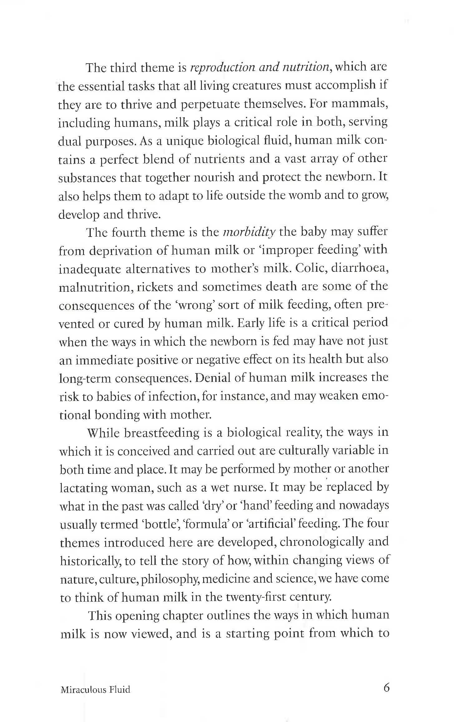 In the Renaissance it became a vital fluid transmutable into flesh by an 'internal alchemist'; in the Enlightenment it flowed from 'Nature's Bountiful Urn'; in the eighteenth century it was a corpuscular liquid formed of 'combustible, plastic and oily parts'; in the nineteenth a chemical formula made up of carbohydrates, proteins and fats; and in modern times a biological fluid composed of macro and micro-nutrients, trophic factors, immunoglobulins and living cells - a live substance, akin to that of the Ancients.