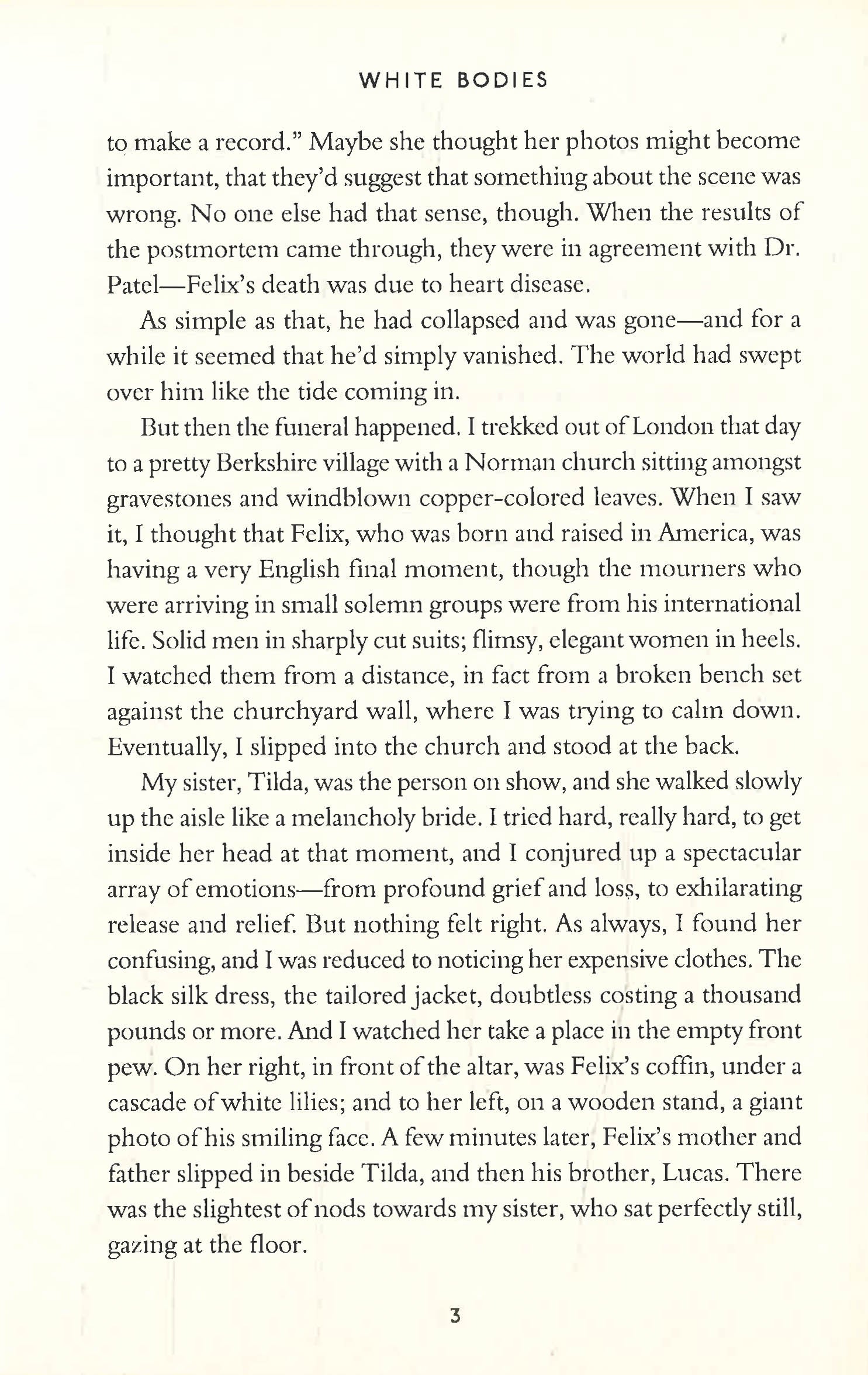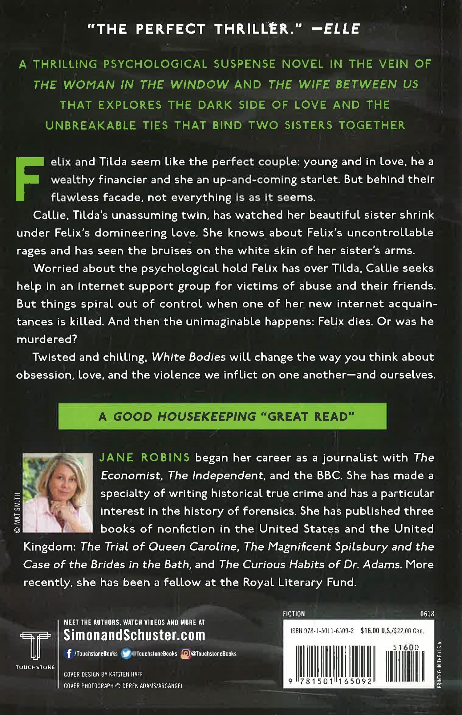 A Good Housekeeping "Great Read" This "deliciously creepy psychological thriller" (Publishers Weekly)--think Strangers on a Train for the modern age--explores the dark side of love and the unbreakable ties that bind two sisters together. Felix and Tilda seem like the perfect couple: young and in love, a financier and a beautiful up-and-coming starlet. But behind their flawless façade, not everything is as it seems. Callie, Tilda's unassuming twin, has watched her sister visibly shrink under Felix's domineering love. She has looked on silently as Tilda stopped working, nearly stopped eating, and turned into a neat freak, with mugs wrapped in Saran Wrap and suspicious syringes hidden in the bathroom trash. She knows about Felix's uncontrollable rages, and has seen the bruises on the white skin of her sister's arms. Worried about the psychological hold that Felix seems to have over Tilda, Callie joins an internet support group for victims of abuse and their friends. However, things spiral out of control and she starts to doubt her own judgment when one of her new acquaintances is killed by an abusive man. And then suddenly Felix dies--or was he murdered? A page-turning work of suspense that announces a stunning new voice in fiction, White Bodies will change the way you think about obsession, love, and the violence we inflict on one another--and ourselves.