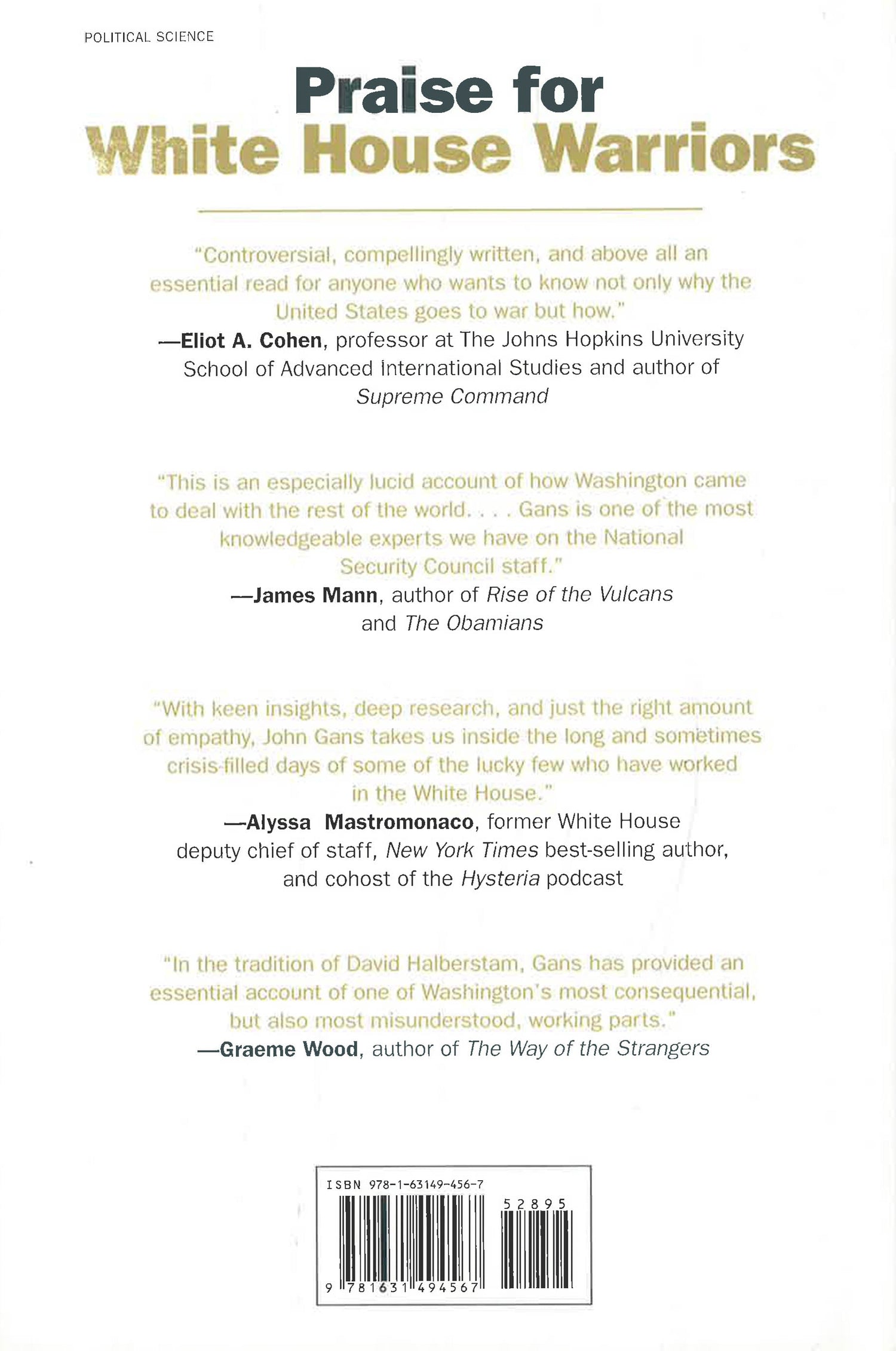 Since its founding more than seventy years ago, the National Security Council has exerted more influence on the president’s foreign policy decisions—and on the nation’s conflicts abroad—than any other institution or individual. And yet, until the explosive Trump presidency, few Americans could even name a member. “A must-read for anyone interested in how Washington really works” (Ivo H. Daalder), White House Warriors finally reveals how the NSC evolved from a handful of administrative clerks to, as one recent commander-in-chief called them, the president’s “personal band of warriors.” When Congress originally created the National Security Council in 1947, it was intended to better coordinate foreign policy after World War II. Nearly an afterthought, a small administrative staff was established to help keep its papers moving. President Kennedy was, as John Gans documents, the first to make what became known as the NSC staff his own, selectively hiring bright young aides to do his bidding during the disastrous Bay of Pigs operation, the fraught Cuban Missile Crisis, and the deepening Vietnam War. Despite Kennedy’s death and the tragic outcome of some of his decision, the NSC staff endured. President Richard Nixon handed the staff’s reigns solely to Henry Kissinger, who, given his controlling instincts, micromanaged its work on Vietnam. In the 1980s, President Ronald Reagan’s NSC was cast into turmoil by overreaching staff members who, led by Oliver North, nearly brought down a presidency in the Iran-Contra scandal. Later, when President George W. Bush’s administration was bitterly divided by the Iraq War, his NSC staff stepped forward to write a plan for the Surge in Iraq. Juxtaposing extensive archival research with new interviews, Gans demonstrates that knowing the NSC staff’s history and its war stories is the only way to truly understand American foreign policy. As this essential account builds to the swift removals of advisors General Michael Flynn and Steve Bannon in 2017, we see the staff’s influence in President Donald Trump’s still chaotic administration and come to understand the role it might play in its aftermath. A revelatory history written with riveting DC insider detail, White House Warriors traces the path that has led us to an era of American aggression abroad, debilitating fights within the government, and whispers about a deep state conspiring against the public.