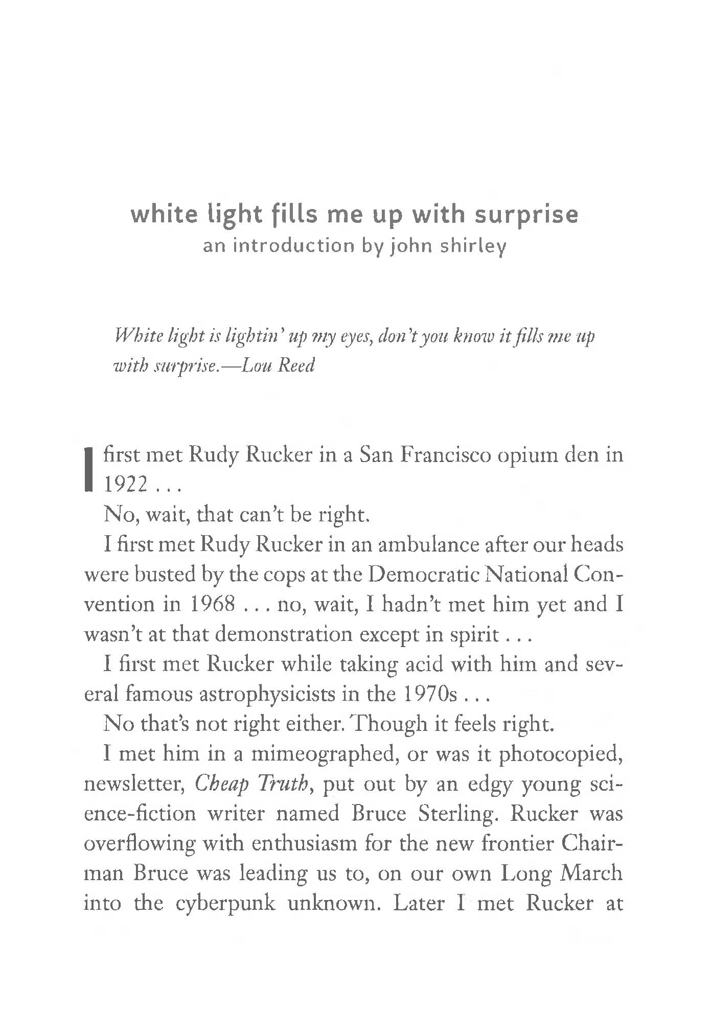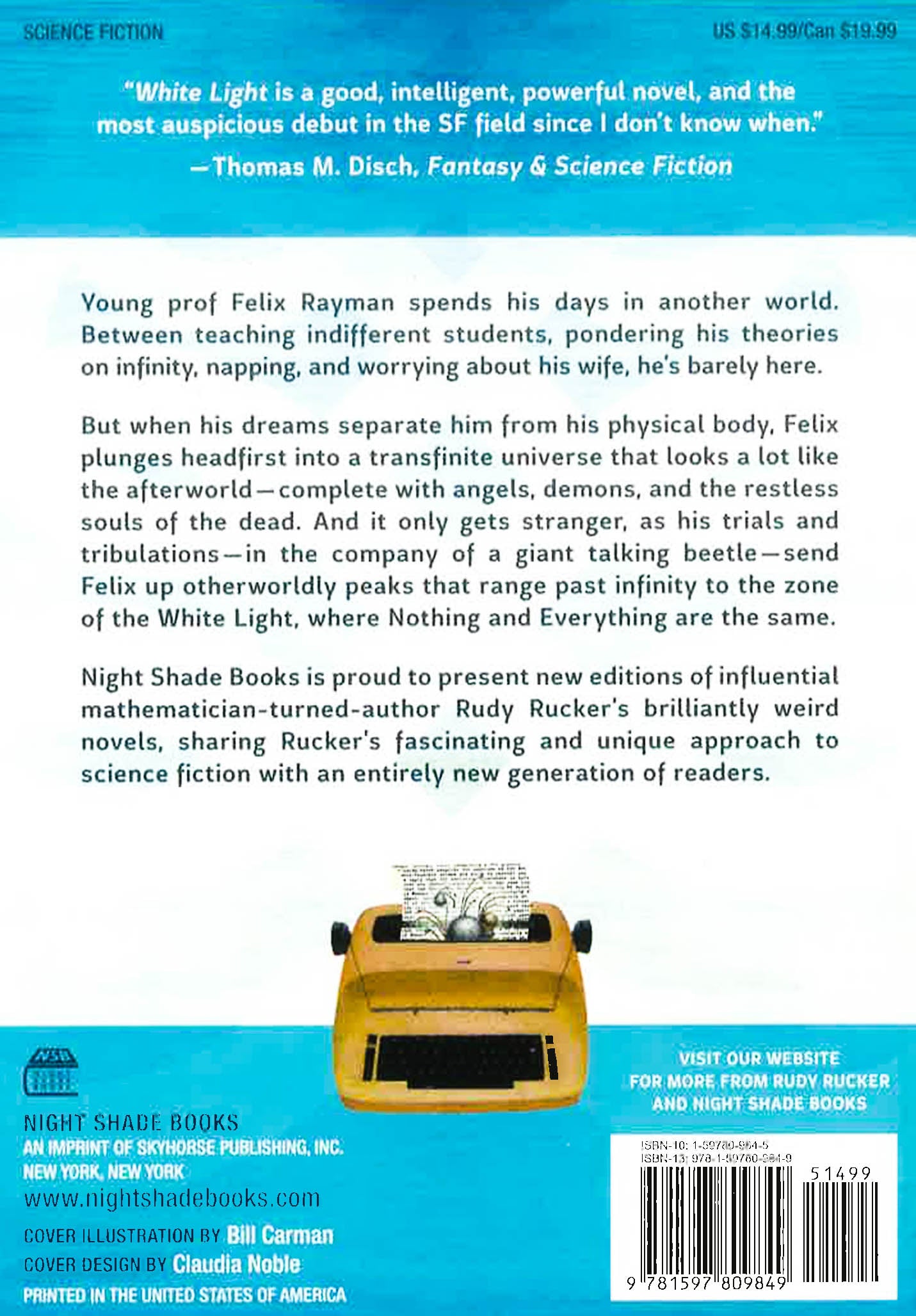 Author Rudy Rucker offers a unique vision of life, death, and the infinite worlds that lie beyond in this thought-provoking, inspiring, romantic-and funny as hell-mathematical SF novel. Young prof Felix Rayman spends his days in another world. Between teaching indifferent students, pondering his theories on infinity, napping, and worrying about his wife, he's barely here. But when his dreams separate him from his physical body, Felix plunges headfirst into a transfinite universe that looks a lot like the afterworld-complete with angels, demons, and the restless souls of the dead. And it only gets stranger, as his trials and tribulations-in the company of a giant talking beetle-send Felix up other-worldly peaks that range past infinity to the zone of the White Light, where Nothing and Everything are the same. Night Shade Books' ten-volume series with Rudy Rucker collects nine of the brilliantly weird novels for which the mathematician-turned-author is known, as well as a tenth, never-before-published book, Million-Mile Road Trip. We're proud to collect in one place so much of the work of this influential figure in the early cyberpunk scene, and to share Rucker's fascinating, unique worldview with an entirely new generation of readers.