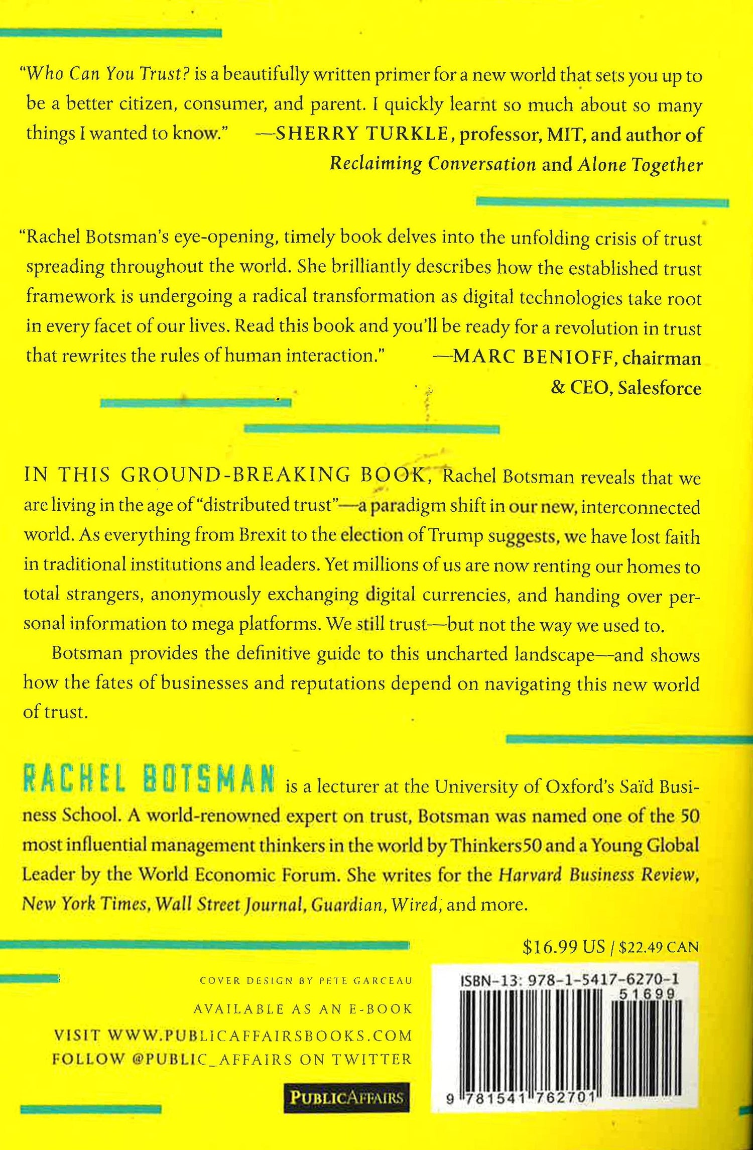 If you can't trust those in charge, who can you trust?From government to business, banks to media, trust in institutions is at an all-time low. But this isn't the age of distrust--far from it. In this revolutionary book, world-renowned trust expert Rachel Botsman reveals that we are at the tipping point of one of the biggest social transformations in human history--with fundamental consequences for everyone. A new world order is emerging: we might have lost faith in institutions and leaders, but millions of people rent their homes to total strangers, exchange digital currencies, or find themselves trusting a bot. This is the age of "distributed trust," a paradigm shift driven by innovative technologies that are rewriting the rules of an all-too-human relationship. If we are to benefit from this radical shift, we must understand the mechanics of how trust is built, managed, lost, and repaired in the digital age. In the first book to explain this new world, Botsman provides a detailed map of this uncharted landscape--and explores what's next for humanity.