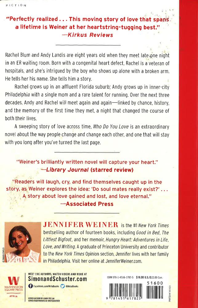 One of the best-loved novels of 2015 is now available in paperback! "A tale of love against the odds." --People Rachel Blum and Andy Landis are just eight-years-old when they meet one night in an ER waiting room. Born with a congenial heart defect, Rachel is a veteran of hospitals, and she's intrigued by the boy who shows up alone with a broken arm. He tells her his name. She tells him a story. After Andy's taken back to a doctor and Rachel's sent back to her bed, they think they'll never see each other again. Yet, over the next three decades, Andy and Rachel will meet again and again--linked by chance, history, and the memory of the first time they met, a night that changed both of their lives. A sweeping, warmhearted, and intimate tale, Who Do You Love is an extraordinary novel about the passage of time, the way people change and change each other, and how the measure of a life is who you love.*This book may have remainder mark*