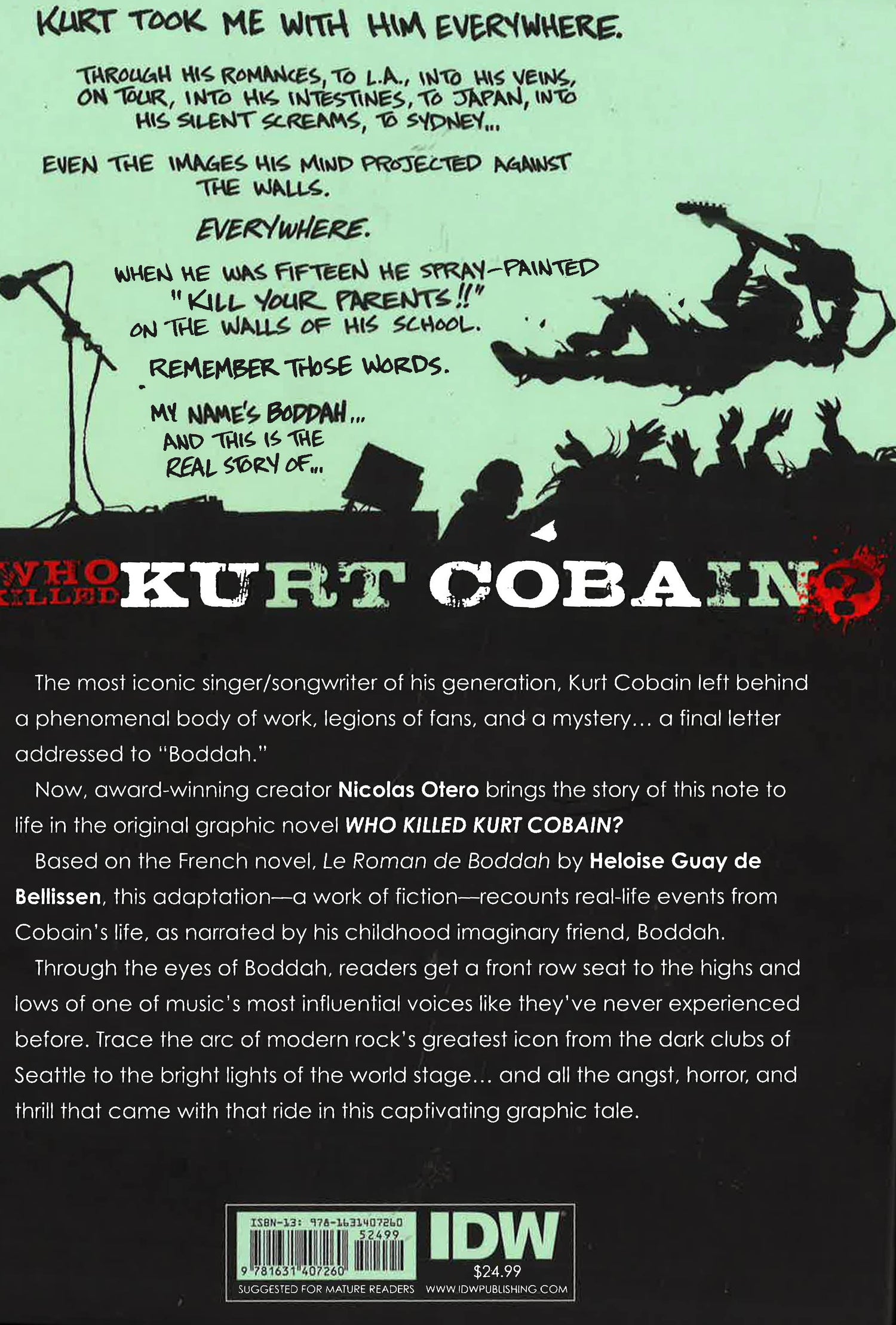 The most iconic singer/songwriter of his generation, Kurt Cobain left behind a phenomenal body of work, legions of fans, and a mystery a final letter addressed to Boddah. Now, award-winning creator Nicolas Otero brings the story of this note to life in the original graphic novel WHO KILLED KURT COBAIN? Based on the French novel, Le Roman de Boddah by Heloise Guay de Bellissen, this adaptation -- a work of fiction -- recounts real-life events from Cobain s life, as narrated by his childhood imaginary friend, Boddah. Through the eyes of Boddah, readers get a front row seat to the highs and lows of one of music s most influential voices like they've never experienced before. Trace the arc of modern rock s greatest icon from the dark clubs of Seattle to the bright lights of the world stage and all the angst, horror, and thrill that came with that ride in this captivating graphic tale.