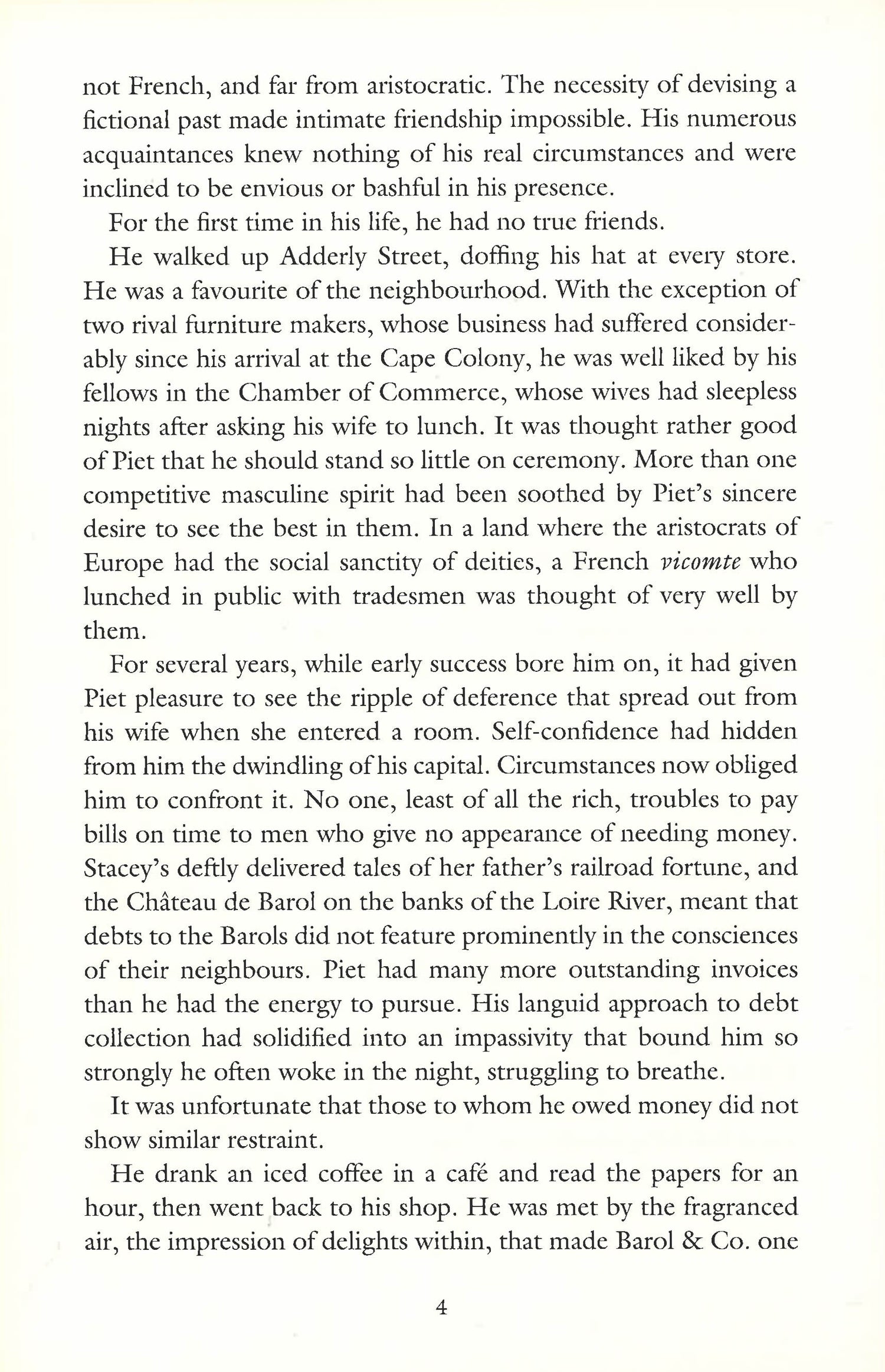 Former tutor Piet Barol and singer Stacey Meadows are making a splash in colonial Cape Town. Styling themselves as the Vicomte and Vicomtesse de Barol, they have been living by their wits - but as the world drifts towards war, their quest for comfort and riches has brought them close to bankruptcy. With creditors at their heels, their furniture business is imploding and only a major win will save them.