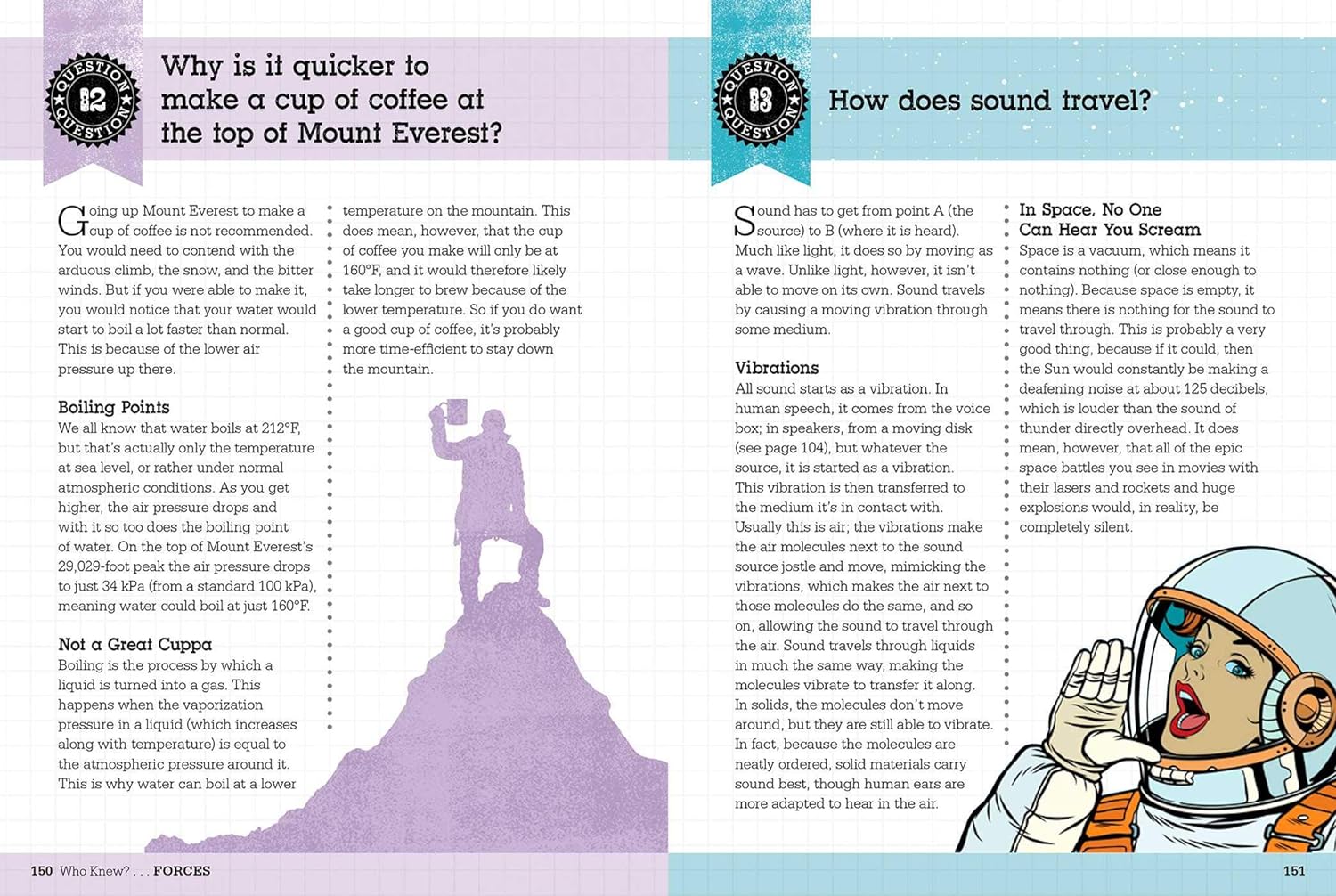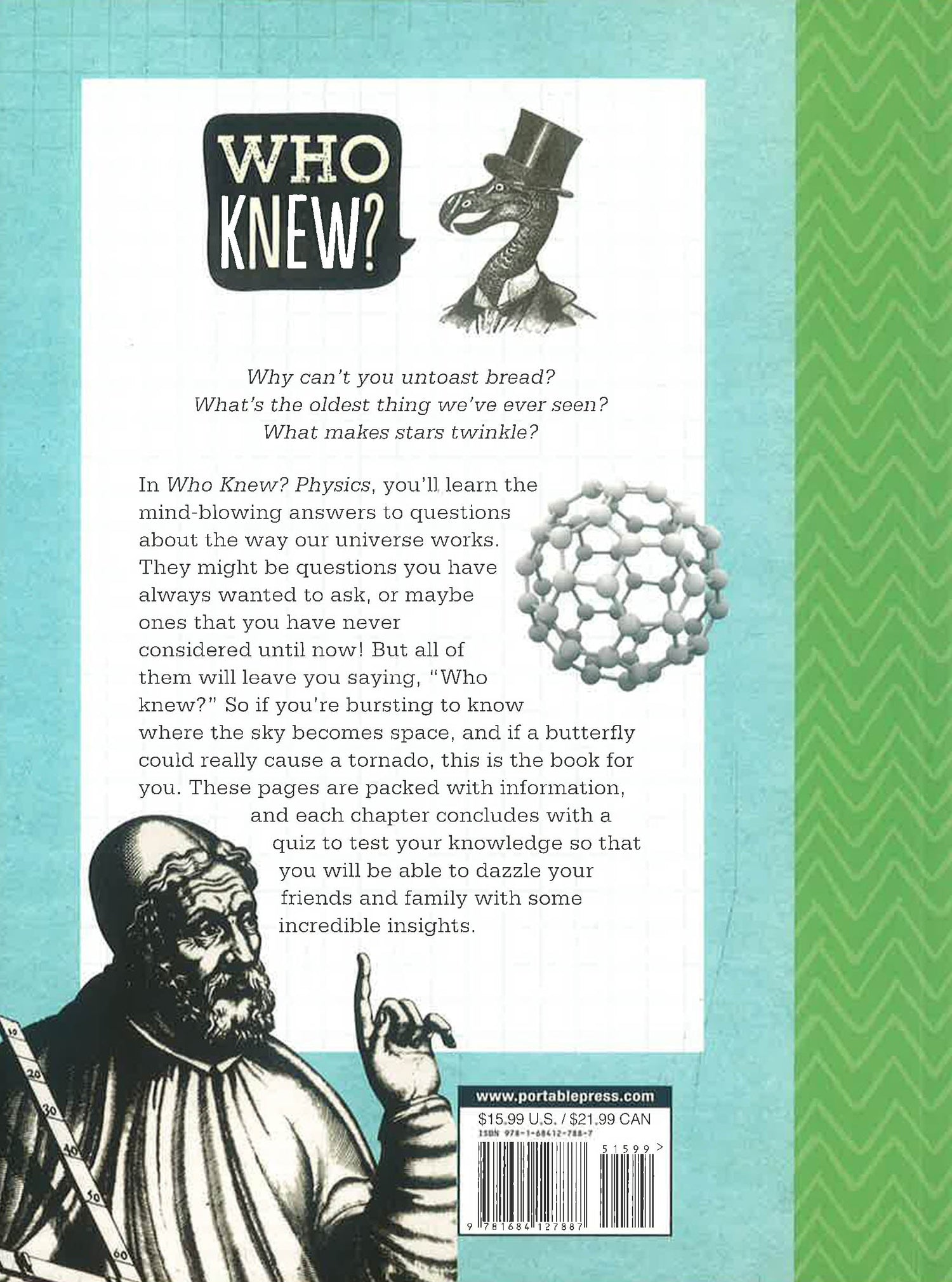 In Who Knew? Physics, you’ll learn the mind-blowing answers to questions about the way our universe works. They might be questions you have always wanted to ask, or maybe ones that you have never considered until now. But they will all leave you saying, “Who knew?” So if you’re bursting to know where the sky becomes space, or if a butterfly could really cause a tornado, this is the book for you. These pages are packed with information, and each chapter concludes with a quiz to test your knowledge so that you will be able to dazzle your friends and family with some incredible insights.