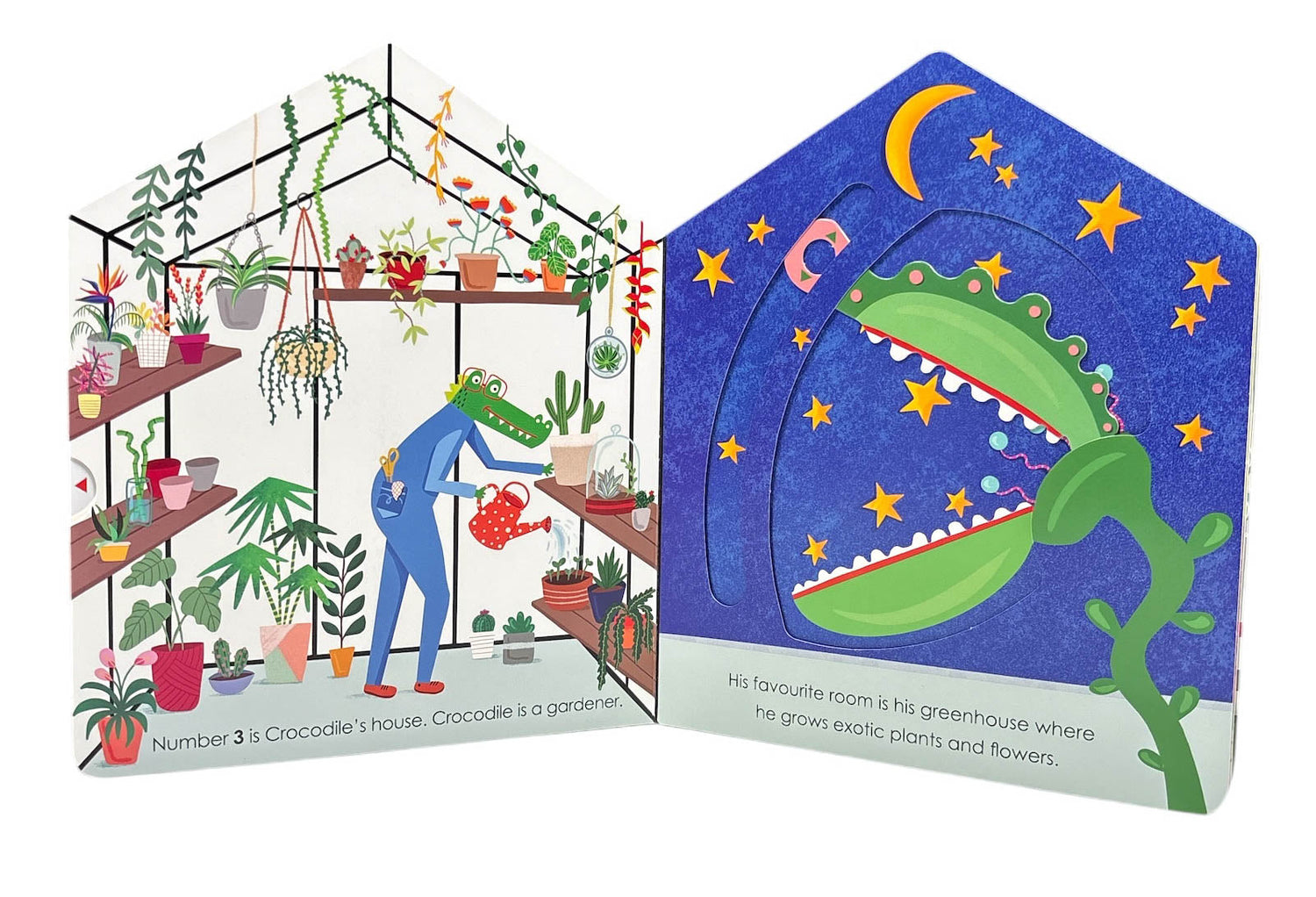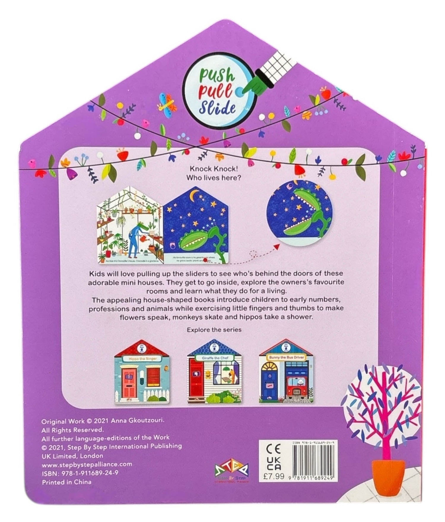 They get to go inside, explore the owners' favorite rooms and learn what they do for a living. The appealing house-shaped books introduce readers to early numbers, professions and animals while exercising little fingers and thumbs to make flowers speak, monkeys skate and hippos take a shower.