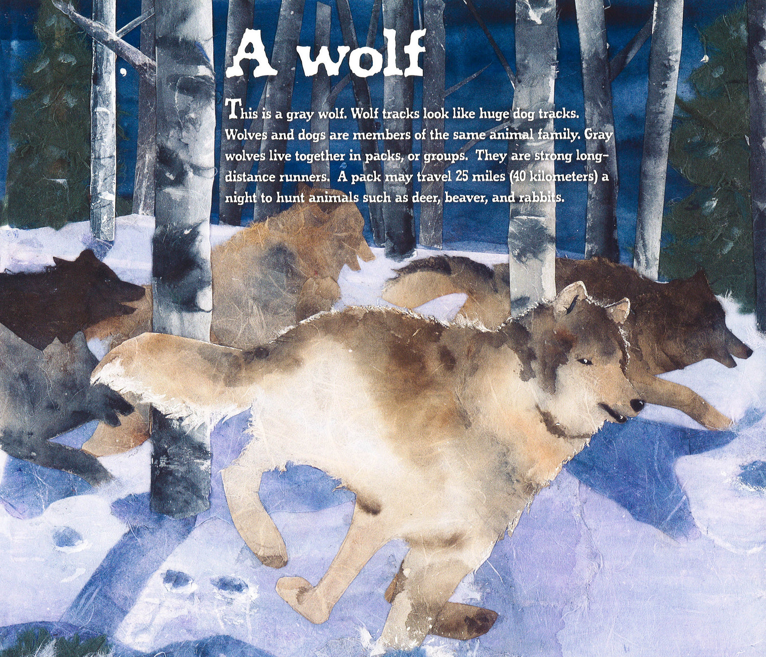 What animal was here? Can you solve the mystery? Study the picture and read the clues to figure out who left each set of tracks. Then turn the page to find out about animals from around the world. Watercolor and collage illustrations show the many kinds of trails that animals leave behind in mud, snow, and sand.