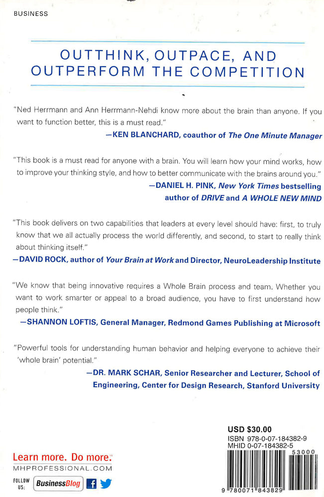 Packed with research, examples, and more actionable content, this book outlines four basic thinking styles - administrator, talker, problem-solver, dreamer - corresponding to the four quadrants of the brain and explains that many are dominated by only one quadrant. OUTTHINK, OUTPACE AND OUTPERFORM THE COMPETITIONNow revised and updated with new applications and practical tools to better use your brain in businessIf you think your business can't get any better, think again. Thanks to the power of Whole Brain (R) Thinking, you can apply what we know about thinking and the brain to transform your organization at every level. Whether you're struggling to keep up with a changing market, stuck with a tired business model, or challenged by difficult colleagues, the proven methods in this updated guide will help you to:IDENTIFY how you and others prefer to thinkIMPROVE your communication skillsINSPIRE creative thinking in yourself and othersINNOVATE faster and work more efficientlyIMPLEMENT changes throughout your organizationINCREASE productivity and beat the competitionEvery business runs on thinking. This book gives you practical tools to assess others' mindsets and get more intentional about how you use your thinking-and how to best engage the thinking of those around you. Filled with essential charts, engaging examples, exercises, and action steps, The Whole Brain Business Book shows you how to rethink your business, prepare for the future,realign your goals, and reinvigorate your team-by putting your whole brain to work.This revised and expanded edition features the latest brain research, updated real-world examples, and more actionable content than ever before. In addition to new stories, data and "mind-hacks", you'll find Herrmann's timeless tips for getting unstuck, identifying the four thinking preferences, and applying research-based techniques that have been proven to work in any business environment around the world. By building and strengthening your thinking agility, you'll be able to work more effectively with others-and leverage the best thinking around-so you can avoid costly delays, missed opportunities, and other business risks. Using the book's point-by-point action steps, insightful case studies, and emerging thought trends, you can really put your mind to work-and get brilliant results.The Whole Brain Business Book will help optimize your management approach, align your organization and strategy, and fully engage your own brain as well as the brains of others to work smarter, faster, and better than you ever thought possible.Ned Herrmann pioneered the Whole Brain Thinking approach and is renowned for his bestselling books and research on thinking and its role in creativity, learning, and business.Ann Herrmann-Nehdi is CEO of Herrmann International and an internationally recognized speaker, author, and thought leader on applying what we know about the brain to improve business performance.