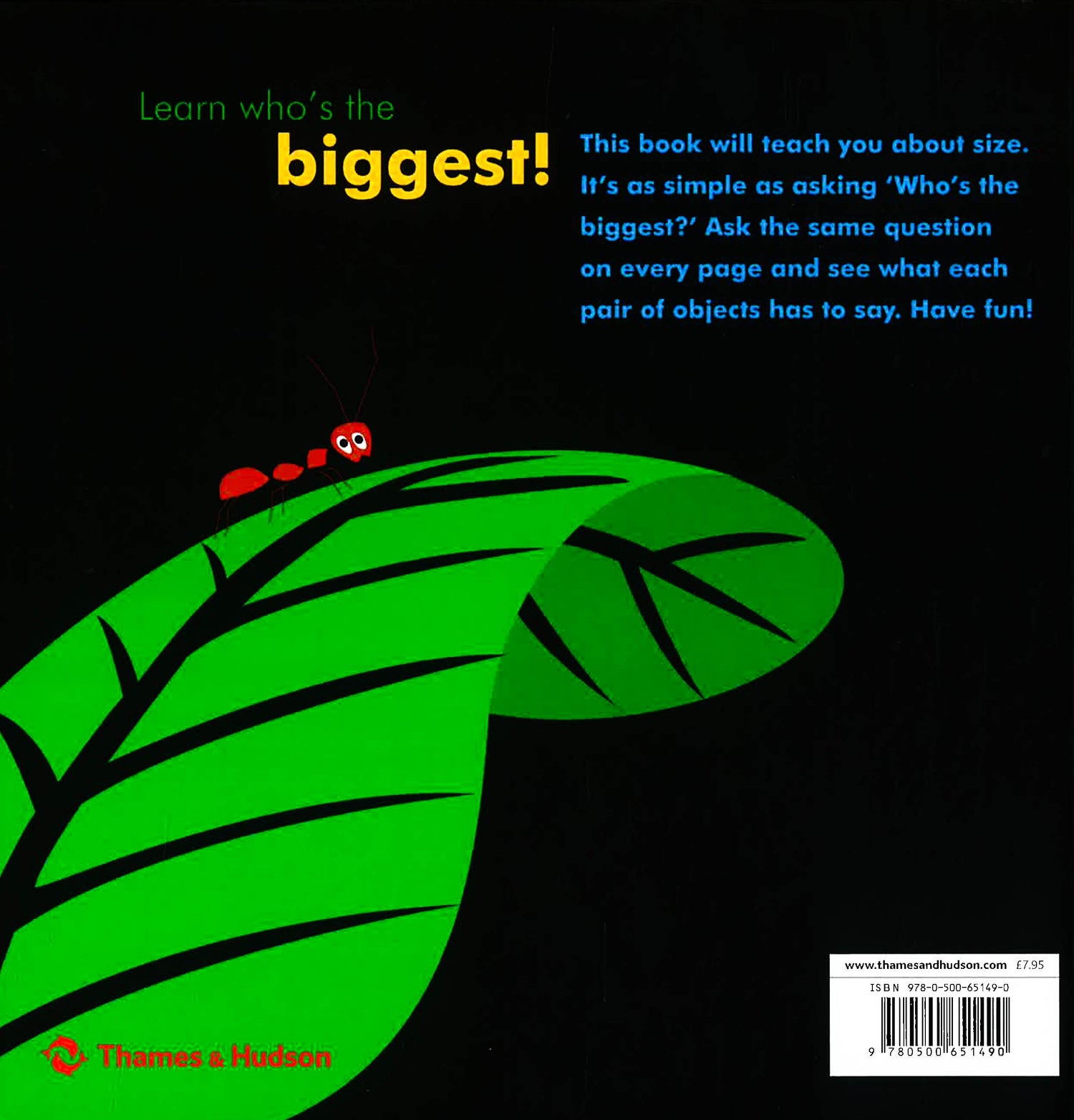 This book teaches pre-schoolers how to describe size simply by having them ask the question 'Who's the biggest?' to the pair of objects on every spread. The fun is in the reply; using evocative verbs, the book helps to conjure up some of the character of the object speaking: '"I am!" trumpets the elephant', or "I am!" warns the hammer to the nail. Parents and guardians reading the book to toddlers will inevitably be drawn into the game, and will enjoy making their replies as expressive as possible. The skills being taught are basic mathematics, which Chedru turns into a fun and creative game that children will love playing. By requiring the reader to actively ask the question 'Who's the biggest?' on every page, the book enourages children to apply an enquiring mindset to the things they encounter.