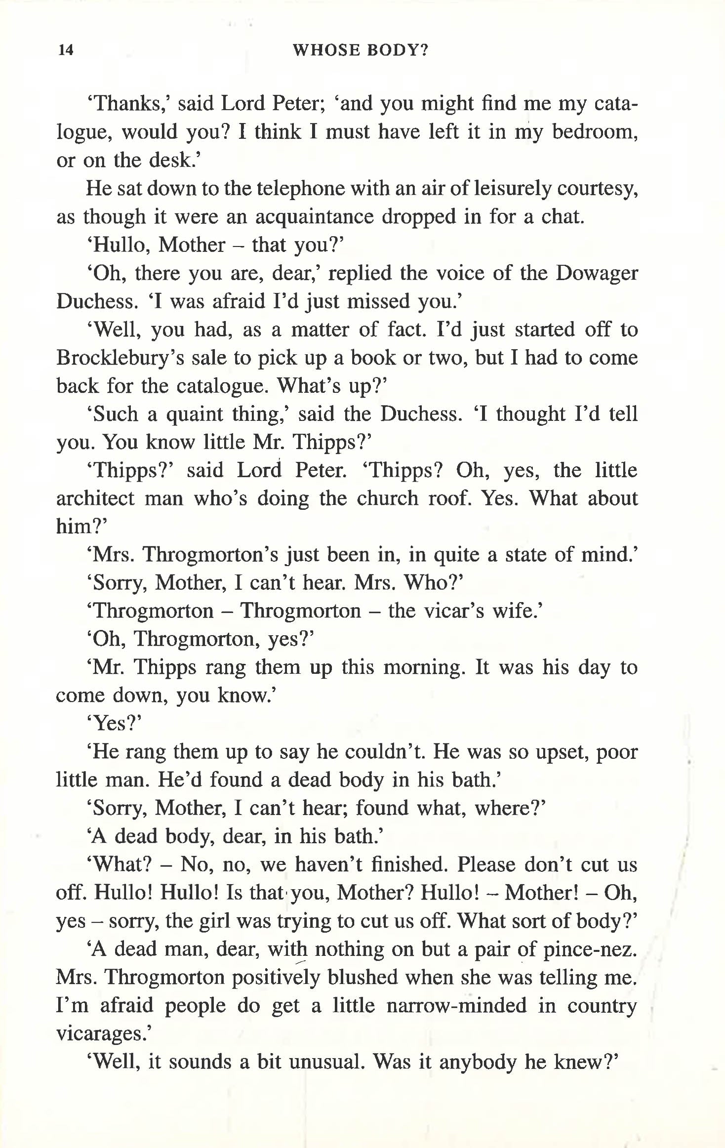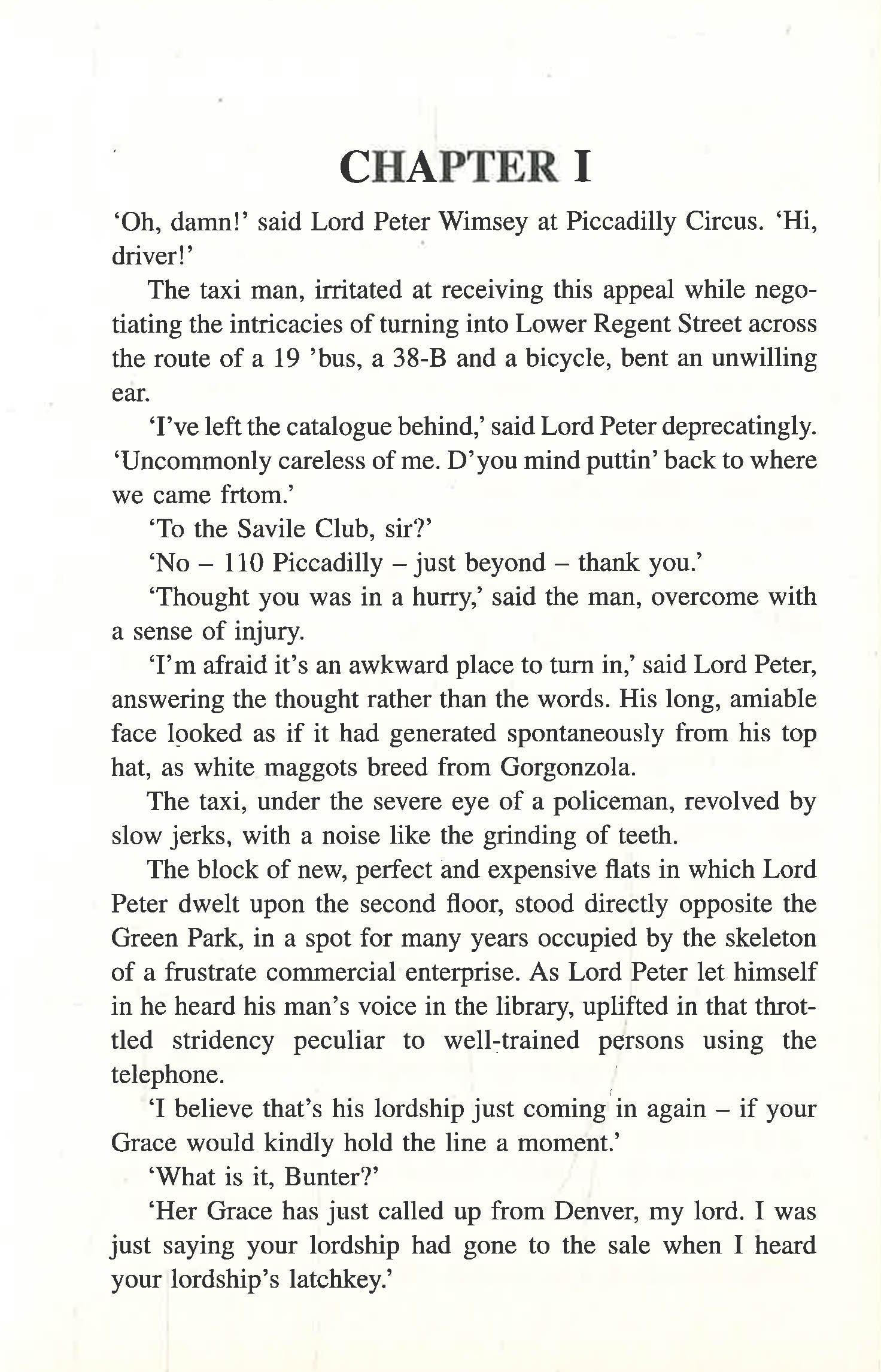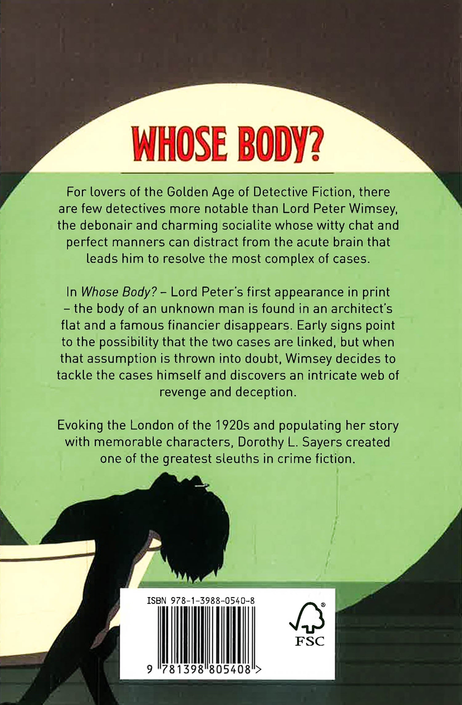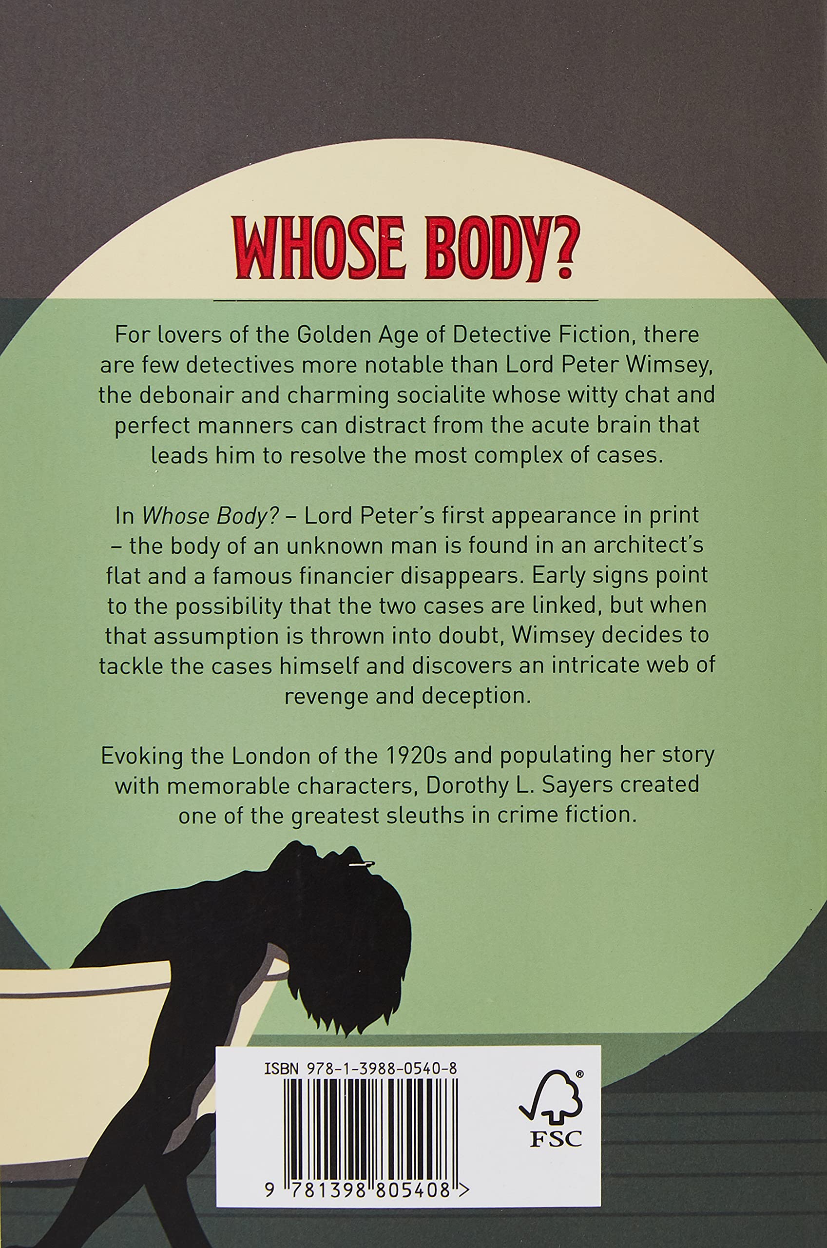 The stark naked body was lying in the tub. Not unusual for a proper bath, but highly irregular for murder -- especially witha pair of gold pince-nez deliberately perched before the sightless eyes. What's more, the face appeared to have been shaved after death. The police assumed that the victim was a prominent financier, but Lord Peter Wimsey, who dabbled in mystery detection as a hobby, knew better. In this, his first murder case, Lord Peter untangles the ghastly mystery of the corpse in the bath.