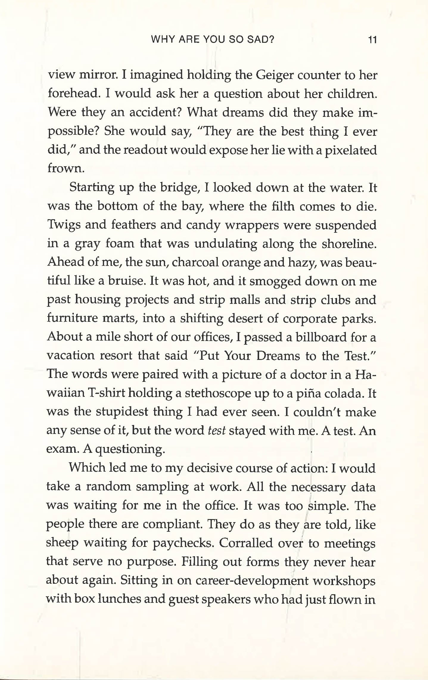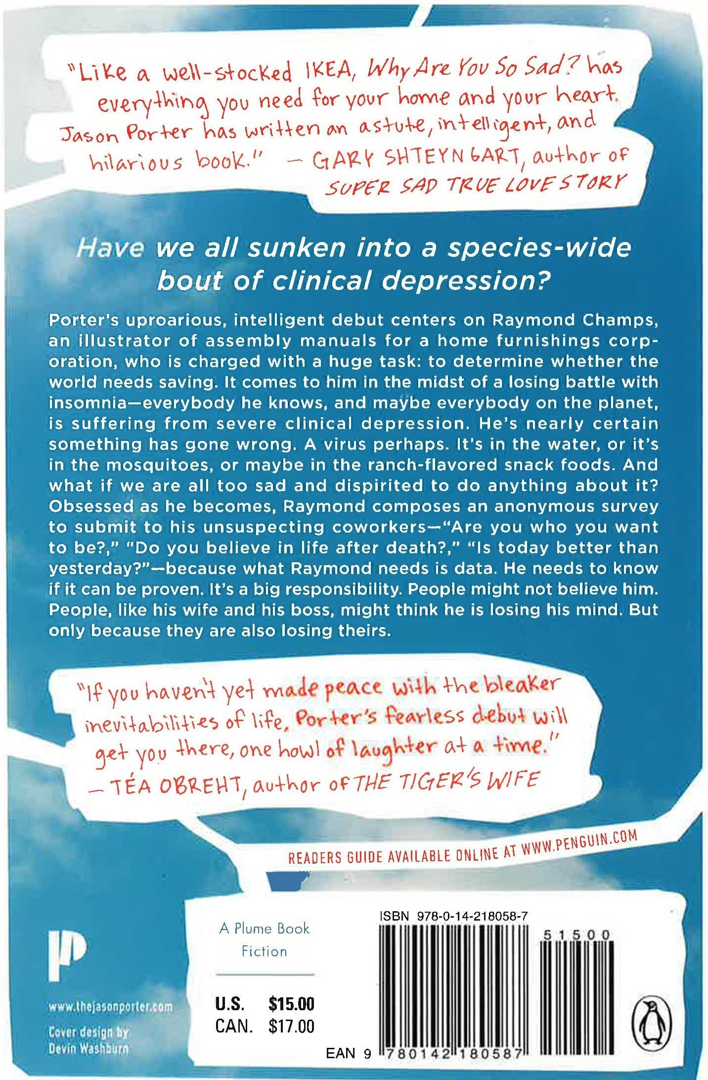 Porter s uproarious, intelligent debut centers on Raymond Champs, an illustrator of assembly manuals for a home furnishings corporation, who is charged with a huge task: To determine whether or not the world needs saving. It comes to him in the midst of a losing battle with insomnia everybody he knows, and maybe everybody on the planet, is suffering from severe clinical depression. He s nearly certain something has gone wrong. A virus perhaps. It s in the water, or it s in the mosquitoes, or maybe in the ranch flavored snack foods. And what if we are all too sad and dispirited to do anything about it? Obsessed as he becomes, Raymond composes an anonymous survey to submit to his unsuspecting coworkers Are you who you want to be?, Do you believe in life after death?, Is today better than yesterday? because what Raymond needs is data. He needs to know if it can be proven. It s a big responsibility. People might not believe him. People, like his wife and his boss, might think he is losing his mind. But only because they are also losing their minds. Or are they?