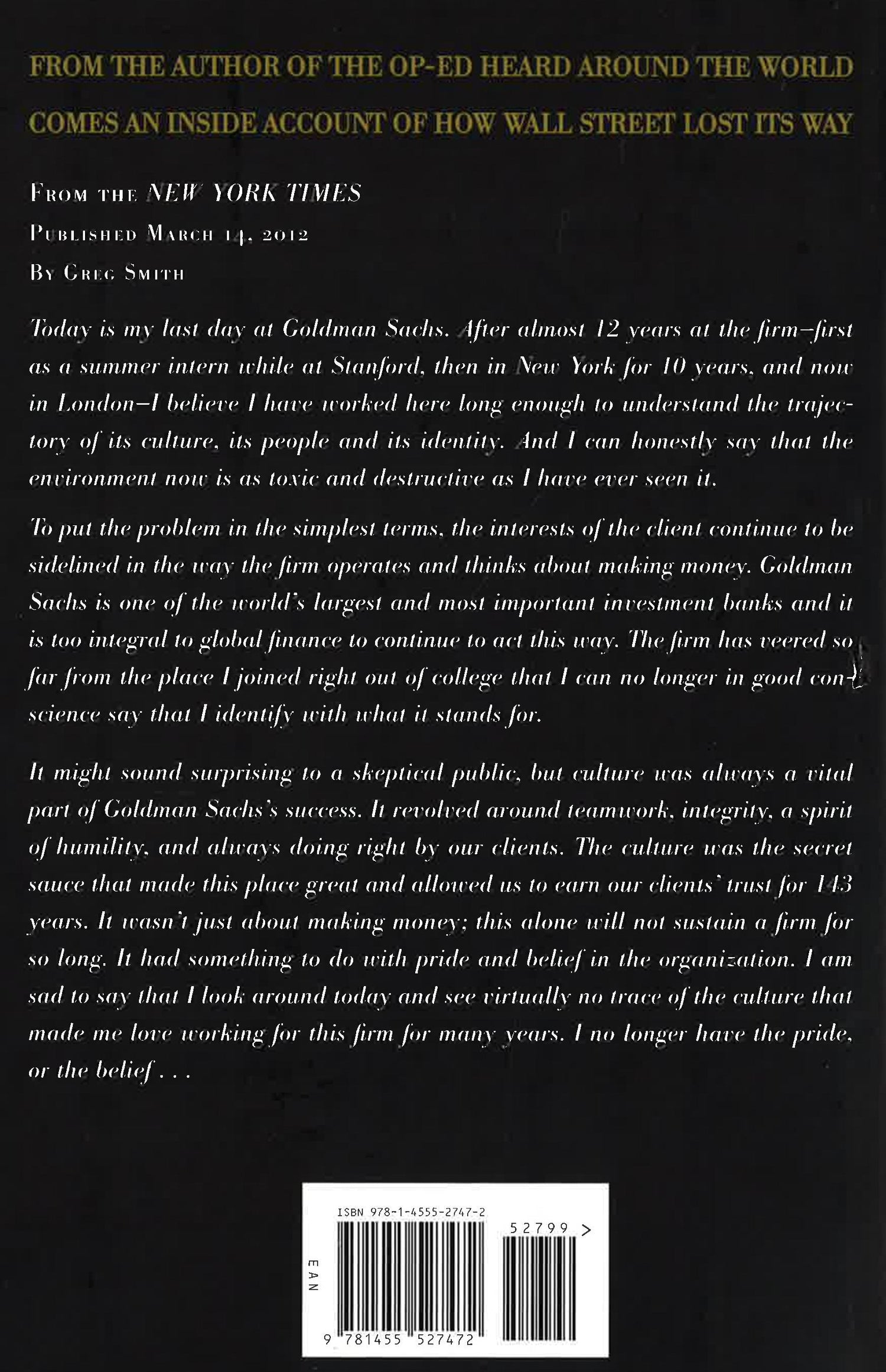 On March 14, 2012, more than three million people read Greg Smith's bombshell Op-Ed in the New York Times titled "Why I Am Leaving Goldman Sachs." The column immediately went viral, became a worldwide trending topic on Twitter, and drew passionate responses from former Fed chairman Paul Volcker, legendary General Electric CEO Jack Welch, and New York City mayor Mike Bloomberg. Mostly, though, it hit a nerve among the general public who question the role of Wall Street in society -- and the callous "take-the-money-and-run" mentality that brought the world economy to its knees a few short years ago. Smith now picks up where his Op-Ed left off. His story begins in the summer of 2000, when an idealistic 21-year-old arrives as an intern at Goldman Sachs and learns about the firm's Business Principle #1: Our clients' interests always come first. This remains Smith's mantra as he rises from intern to analyst to sales trader, with clients controlling assets of more than a trillion dollars. From the shenanigans of his summer internship during the technology bubble to Las Vegas hot tubs and the excesses of the real estate boom; from the career lifeline he received from an NFL Hall of Famer during the bear market to the day Warren Buffett came to save Goldman Sachs from extinction-Smith will take the reader on his personal journey through the firm, and bring us inside the world's most powerful bank. Smith describes in page-turning detail how the most storied investment bank on Wall Street went from taking iconic companies like Ford, Sears, and Microsoft public to becoming a "vampire squid" that referred to its clients as "muppets" and paid the government a record half-billion dollars to settle SEC charges. He shows the evolution of Wall Street into an industry riddled with conflicts of interest and a profit-at-all-costs mentality: a perfectly rigged game at the expense of the economy and the society at large. After conversations with nine Goldman Sachs partners over a twelve-month period proved fruitless, Smith came to believe that the only way the system would ever change was for an insider to finally speak out publicly. He walked away from his career and took matters into his own hands. This is his story.