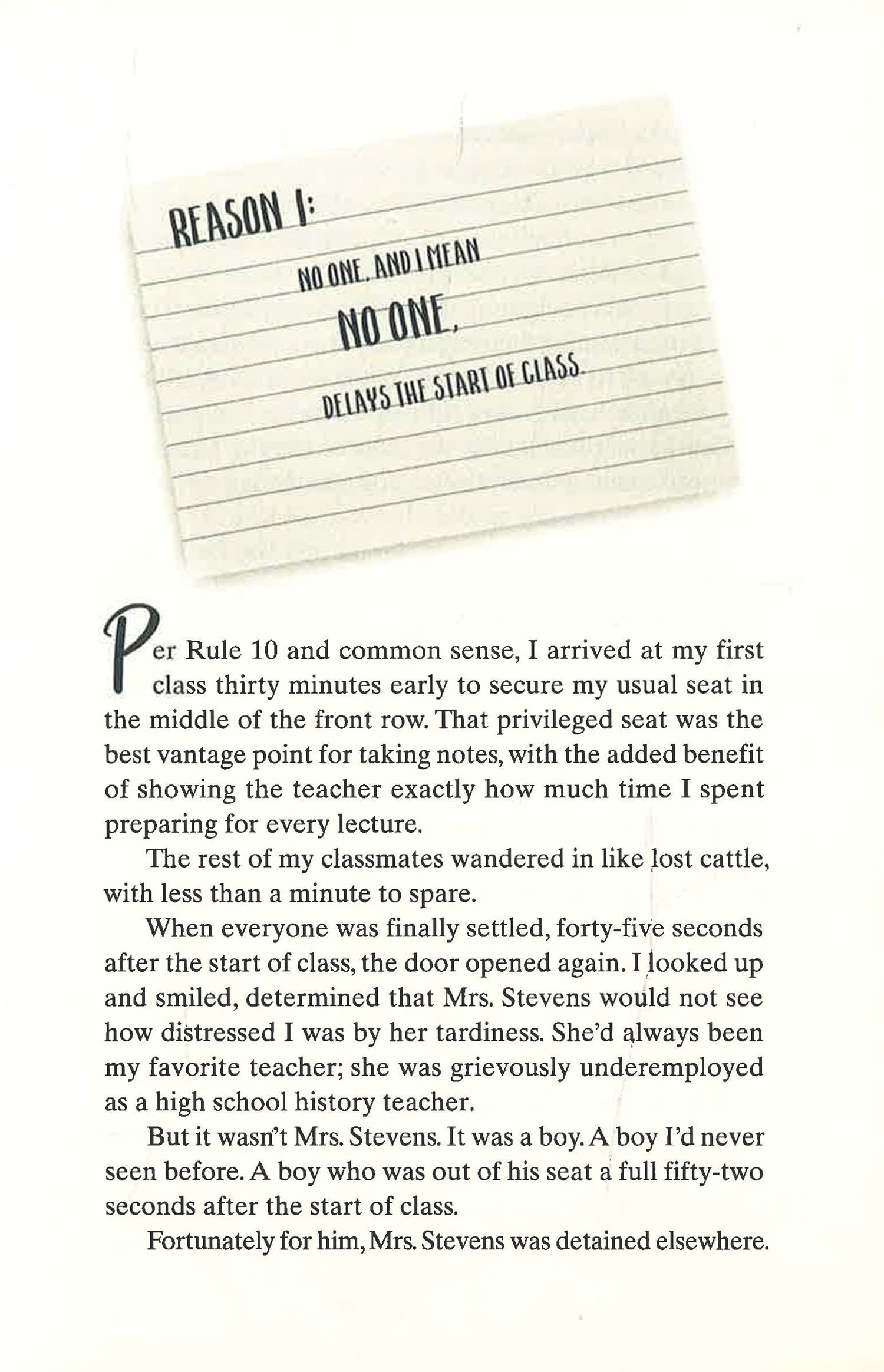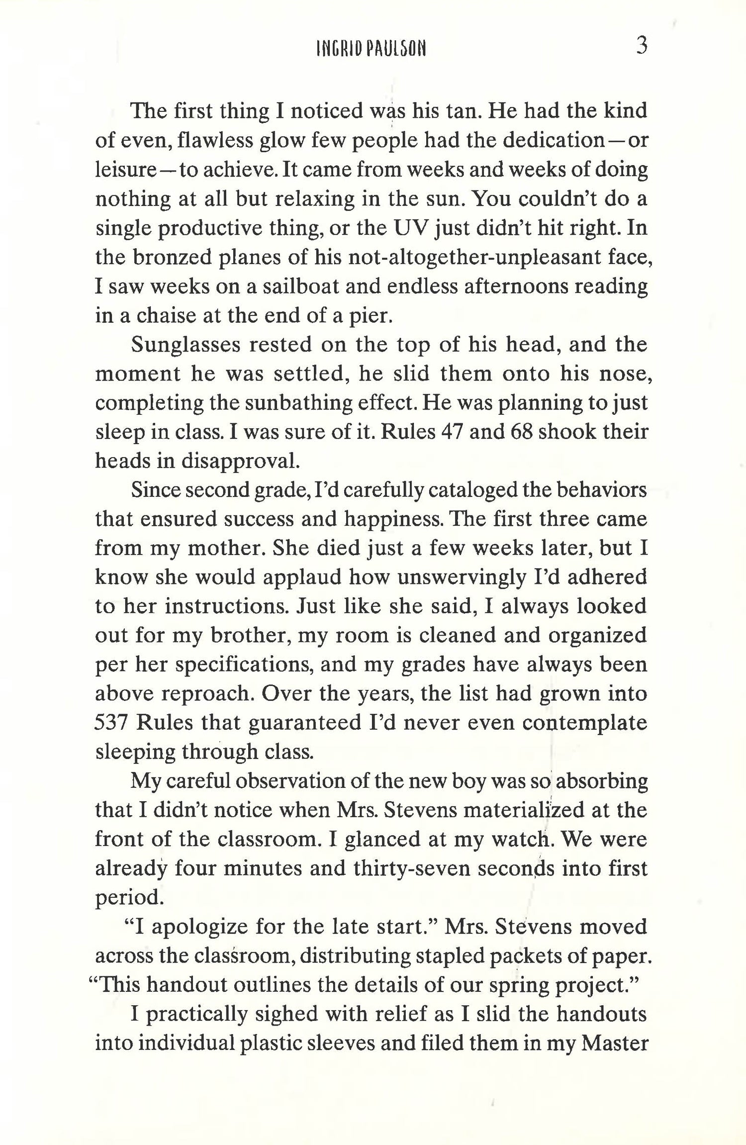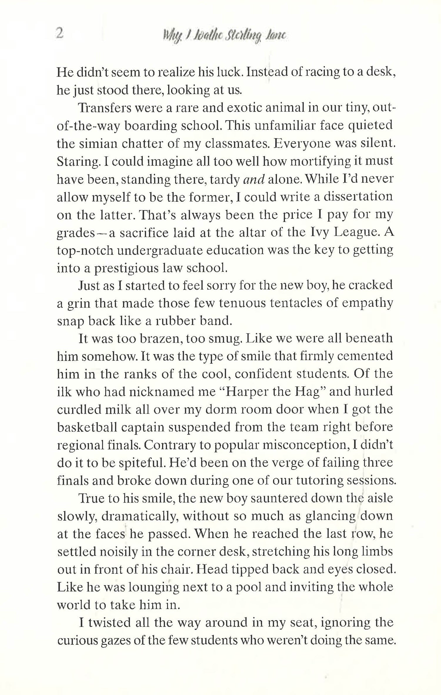 Per her 537 rules, Harper Campbell keeps her life tidy - academically and socially. But the moment Sterling Lane transfers into her tiny boarding school, her twin brother gets swept up in Sterling’s pranks and schemes and nearly gets expelled. Harper knows it’s Sterling’s fault, and to protect her brother, she vows to take him down. As she exposes his endless school violations, he keeps striking back, framing her for his own infractions. Worst of all, he’s charmed the administration into thinking he’s harmless, and only Harper sees him for the troublemaker he absolutely is.As she breaks rule after precious rule in her battle of wits against Sterling and tension between them hits a boiling point, she’s horrified to discover that perhaps the two of them aren’t so different. And maybe she doesn't entirely hate him after all. Teaming up with Sterling to save her brother might be the only way to keep from breaking the most important rule - protecting Cole.