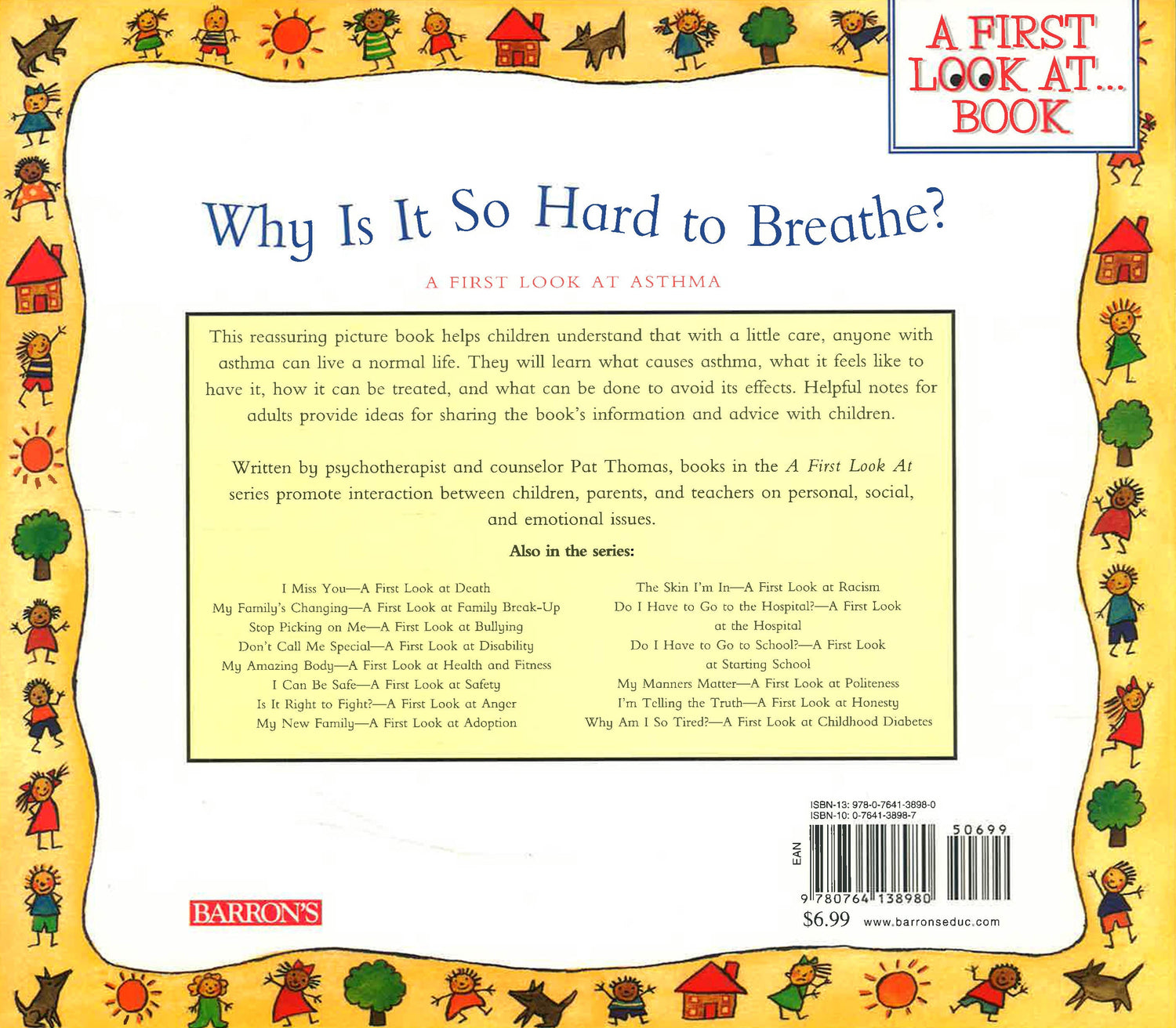 An easy-to-understand text complemented with color illustrations reassures children who suffer from asthma, explaining what it is and reminding them that with proper treatment and medical council, they can participate in all childhood activities and lead normal lives. All titles in the very helpful A First Look at. . . series speak directly to preschool and early-grades children, encouraging them to explore their feelings and talk to trusted elders about ways of dealing with things that bother them. Some problems discussed in these books are passing in nature and can be solved with relative ease. Others, like those treated in this new title, encourage children who have long-term health problems to trust in the professional medical care that they require, and not be frightened by it. The book features child-friendly color illustrations on every page. A brief section at the end of the book presents specific advice and information for parents.