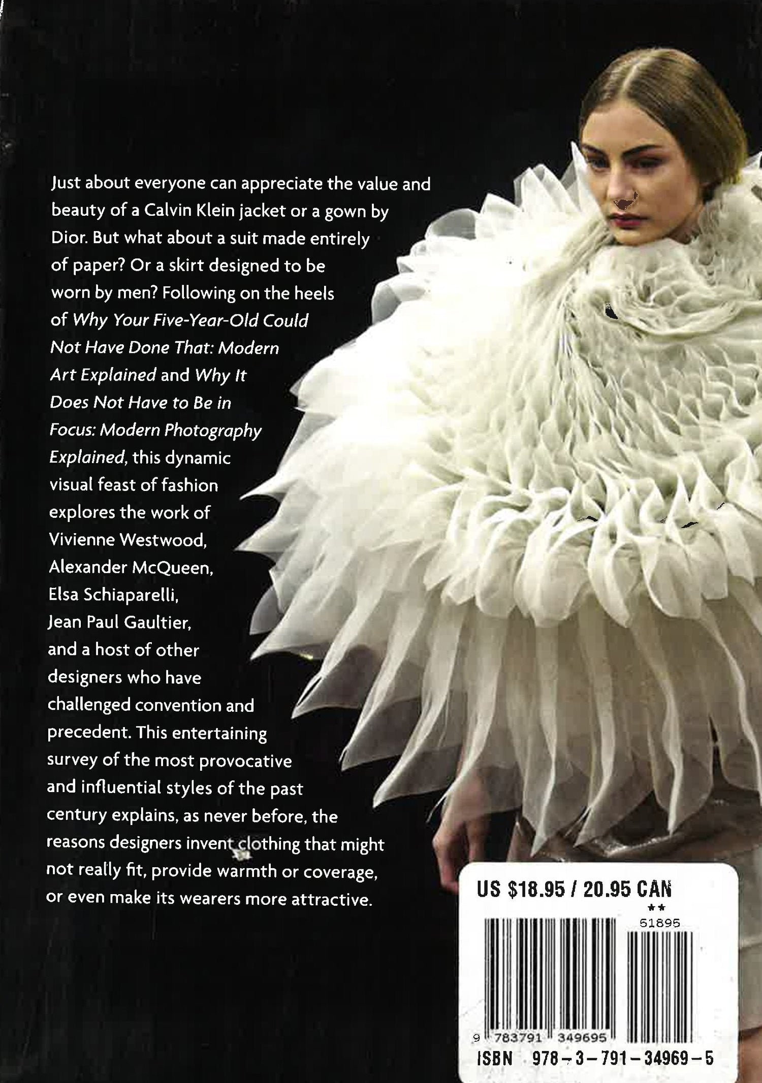 This engaging and well-informed book demystifies and celebrates avant-garde clothing of the past century. Just about everyone can appreciate the value and beauty of a Calvin Klein jacket or a gown by Dior. But what about a suit made entirely of paper? Or a skirt designed to be worn by men? These are just a few of the audacious examples in this dynamic visual feast of fashion. Following on the heels of the highly successful Why Your Five-Year-Old Could Not Have Done That: Modern Art Explained and Why It Does Not Have to Be in Focus: Modern Photography Explained, this book is organized into chapters that focus on fantasy, displacement, provocation, distortion, and volume. Author Marnie Fogg explains how figures such as Vivienne Westwood, Alexander McQueen, Thierry Mugler, Elsa Schiaparelli, and Jean Paul Gaultier challenged convention and precedent in ways that have both provoked and influenced their successors. Stunning, colorful images of 100 groundbreaking garments accompany engaging and enlightening commentary that explores the reasons for designing clothing that might not really fit, provide warmth or coverage, or even make its wearers more attractive. Beautifully produced and reasonably priced, this fun and informative look at weird and wonderful couture will delight all fans of fashion.