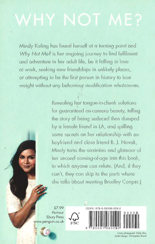 Mindy Kaling has found herself at a turning point. In this book, she shares her journey to find fulfilment and adventure in her adult life, be it falling in love at work, seeking new friendships in unlikely places, or attempting to be the first person in history to lose weight without any behaviour modification whatsoever. Mindy Kaling has found herself at a turning point. So in Why Not Me?, she shares her ongoing journey to find fulfilment and adventure in her adult life, be it falling in love at work, seeking new friendships in unlikely places, or attempting to be the first person in history to lose weight without any behaviour modification whatsoever.In "How to Look Spectacular", she reveals her tongue-in-cheek solutions for guaranteed on-camera beauty. "Player" tells the story of Mindy being seduced, then dumped, by a female friend in LA. And in "Soup Snakes," she spills some secrets on her relationship with ex-boyfriend and close friend B. J. Novak.Mindy has put the anxieties, the glamour and the celebrations of her second coming-of-age into this book, to which anyone can relate. (And, if they can't, they can skip to the parts where she talks about meeting Bradley Cooper.)