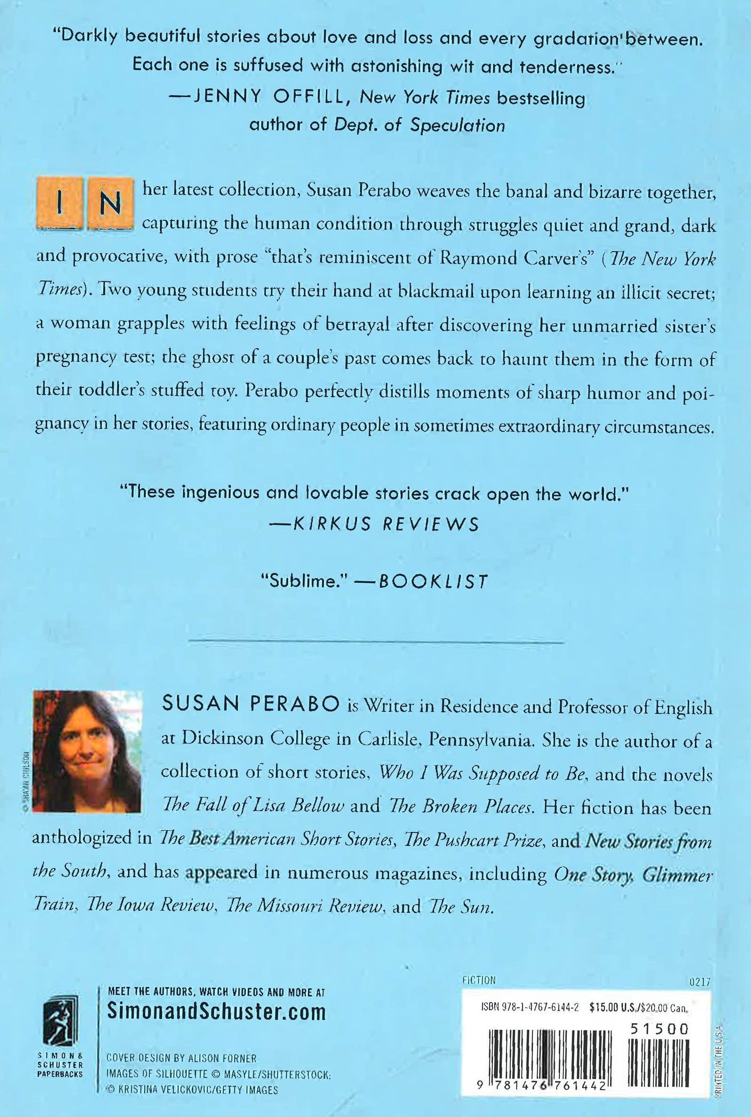 In her latest collection, Susan Perabo weaves the banal and bizarre together, capturing the human condition through struggles quiet and grand, dark and provocative. Two young students try their hand at blackmail upon learning an illicit secret; a woman grapples with feelings of betrayal after discovering her unmarried sister's pregnancy test; the ghost of a couple's past comes back to haunt them in the form of their toddler's stuffed toy. Perabo perfectly distills moments of sharp humor and poignancy in her stories, featuring ordinary people in sometimes extraordinary circumstances.